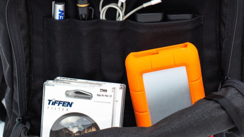 両サイドにはウォーターボトル等を入れられるメッシュポケットと、小型三脚の持ち運びに適した三脚用ストラップとポケットを装備。大きなフロントポケットにはオーガナイザーを備え、小物の収納に最適だ。