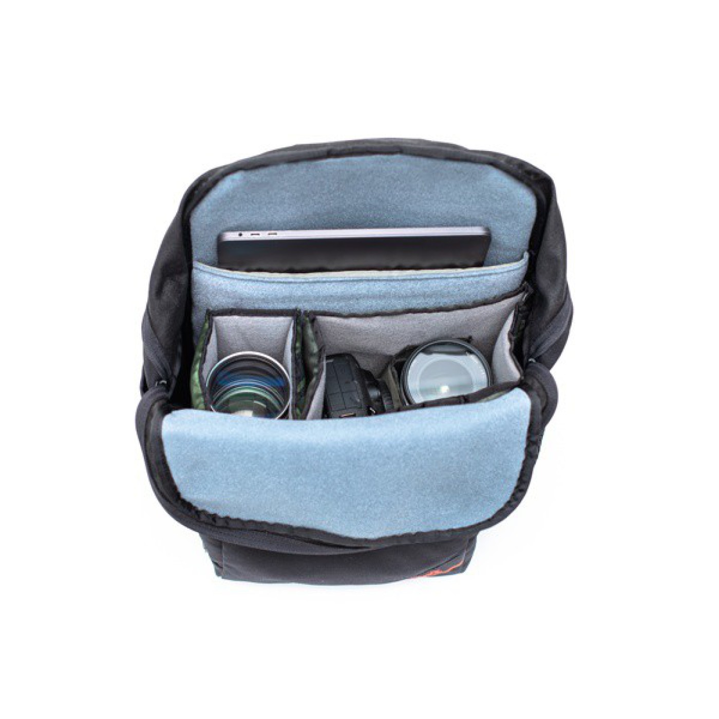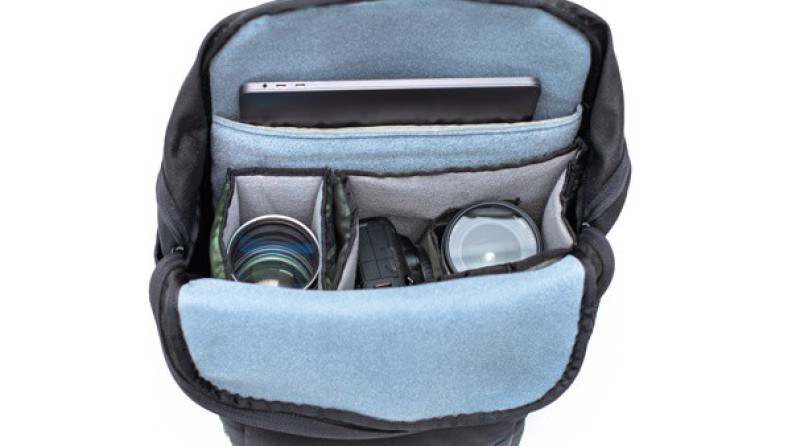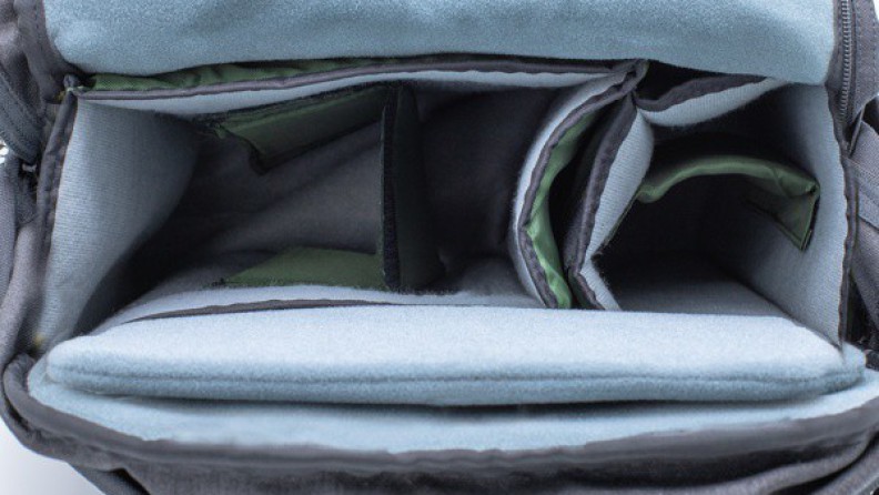 2サイズのコンパートメントが同梱され、それぞれ中仕切りが一枚付属している。収納目安は、中型一眼レフ1台、レンズ2-3本程度。また、コンパートメントの上部には仕切りが備わり、素早く取り出したい機材を収納可能だ。