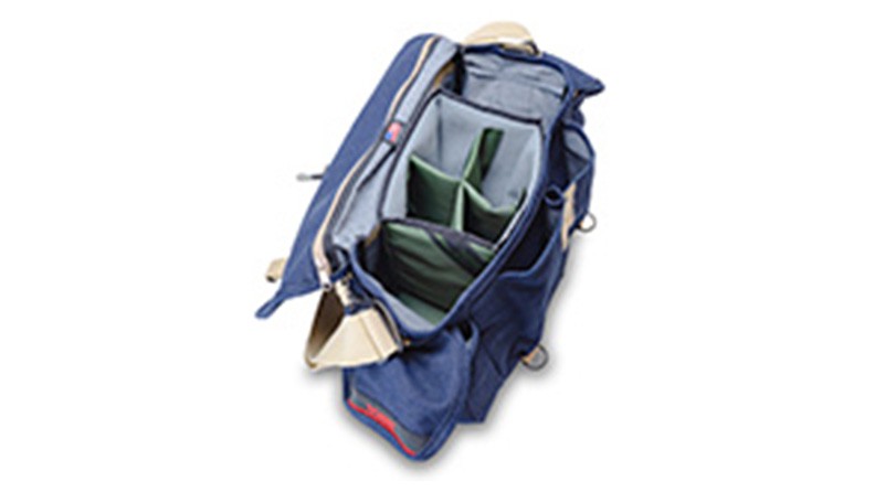 4つのコンパートメントに分かれたインナーケースが付属し、大型一眼レフ2台、レンズ4-6本、その他アクセサリーを収納可能。底部には取り外し可能なクッション性のあるパッドが敷かれており、衝撃を和らげる。