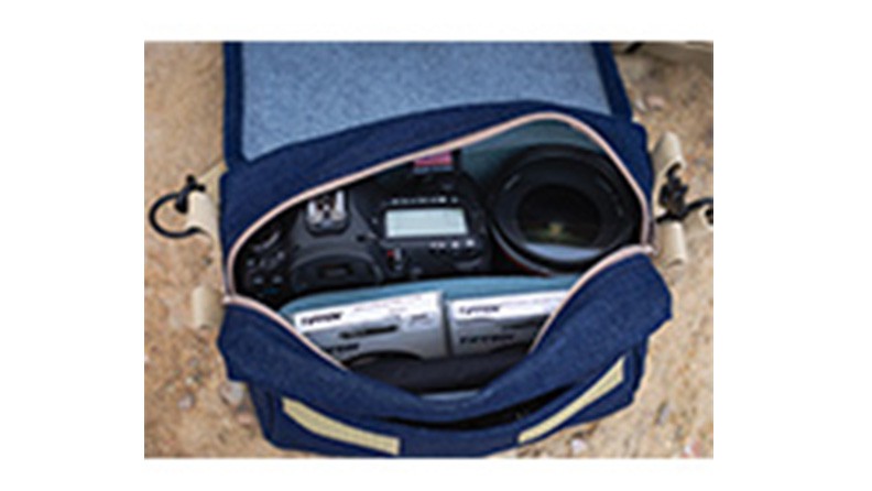 2枚の中仕切りが付属し、一眼レフまたはミラーレスカメラ1台、レンズ1-2本、その他アクセサリーを収納可能。滑り止め付きのショルダーストラップは取り外しができ、ショルダーストラップもしくは別売のドンケ製ベルト(FA-745)を背面のベルトループに通すことでウエストバッグとしても使用できる。