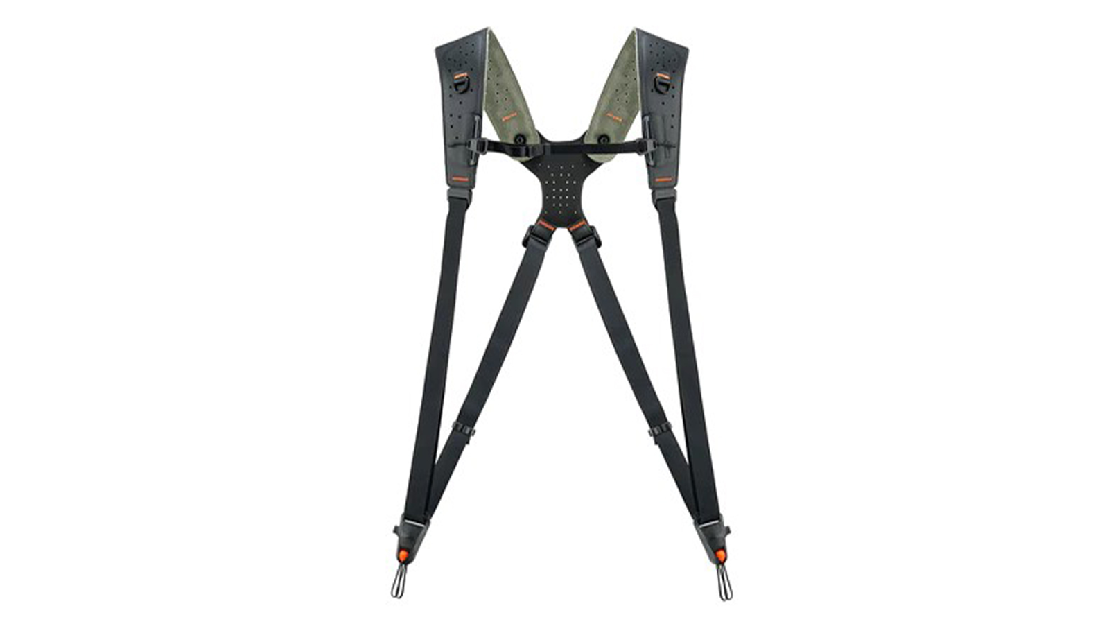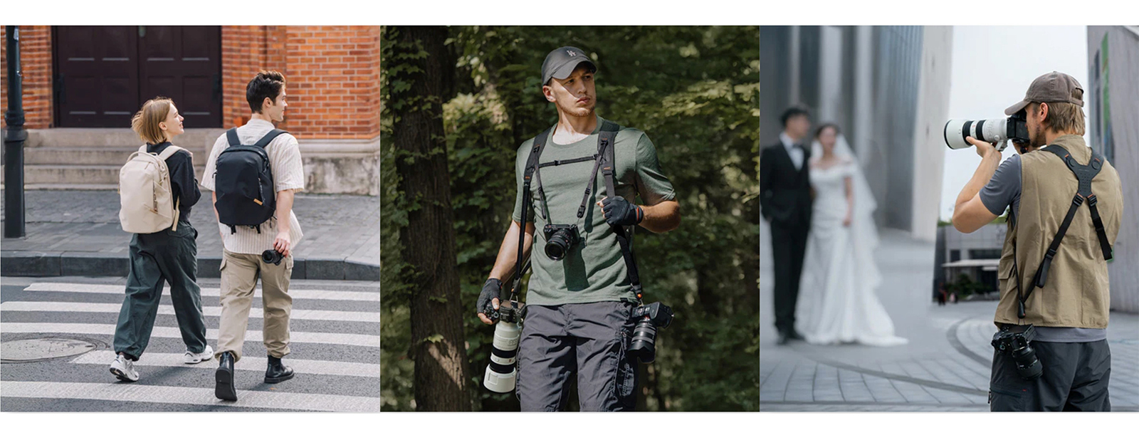 最大3台のカメラ機材を同時に安定して装着できる、商業撮影にも対応したデュアルショルダータイプのストラップ。Dリングによる柔軟な拡張性に加え、通気性に優れた幅広パッドで肩への負担を軽減する。AutoFit機構により、肩幅に応じてパッドが自動でフィットする。