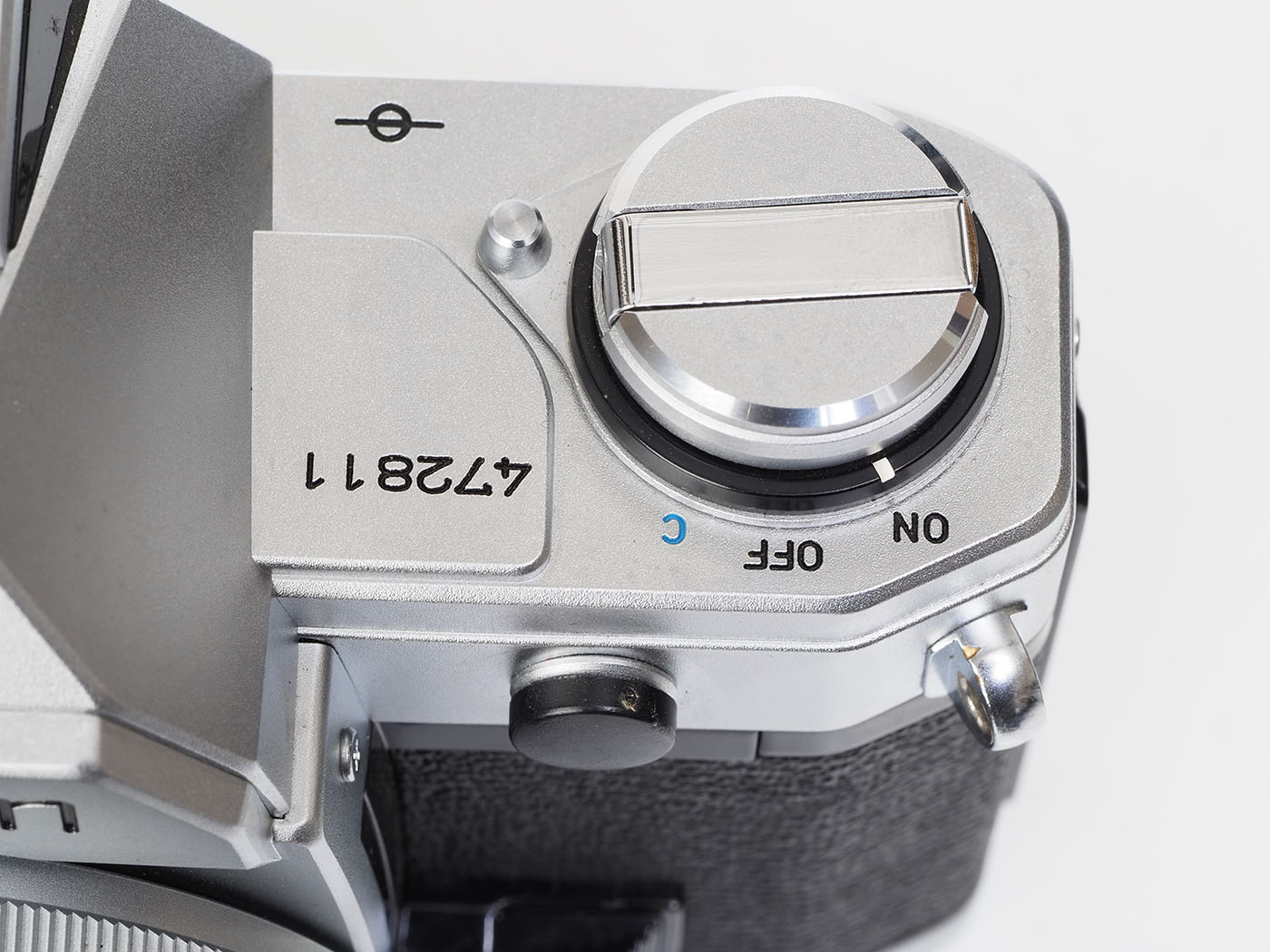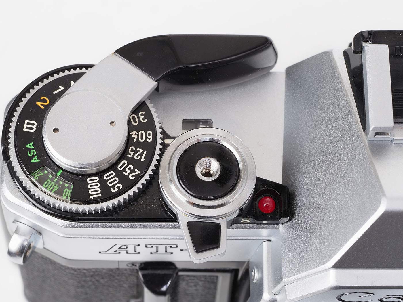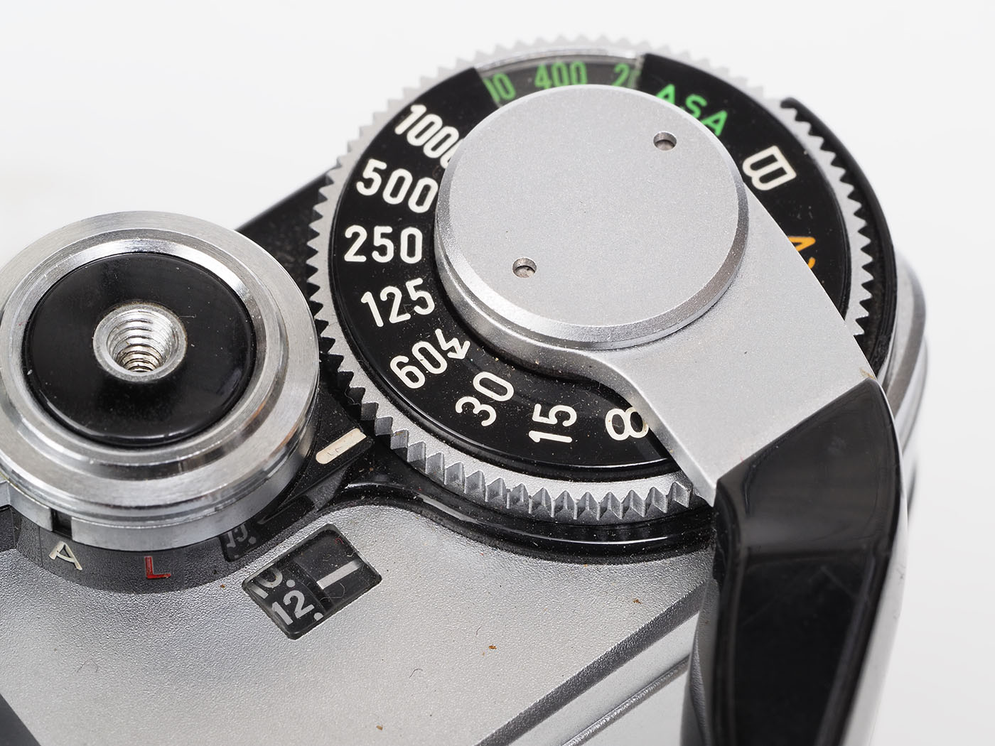 シャッタースピードダイヤルは歯車をそのまま持ってきましたみたいなAE-1とデザイン同じ。回すと人差し指の腹がイタイです。