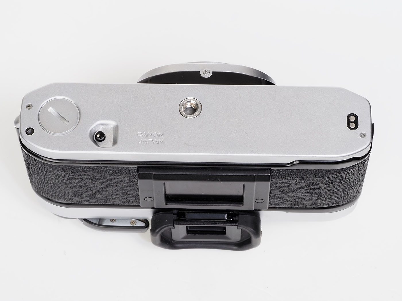 ボディ底部です。ワインダー装着できます。コマ速はどのくらいかな。遅いですね。AE-1ではボディ底部のみ真鍮だったんですが、AT-1はどうなのかな。