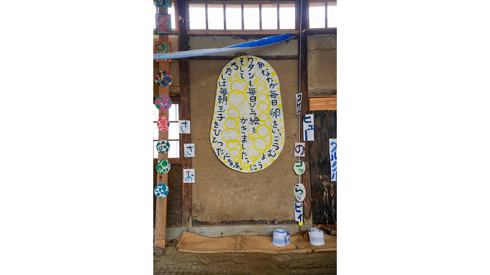牛島智子は、変形カンバスによる絵画制作と、拠点とする地域の産業や歴史に根ざした素材を支持体に用いるインスタレーションの制作を続けてきた。過去に発表した詩や言葉を不定形の和紙に書き写した「変形和紙文字」は、近年取り組むシリーズのひとつで、牛島の思考の一端を開示するものだ。本展では「変形和紙文字」を構成要素のひとつとし、日々の生活と制作行為を重ねた新作インスタレーション《ひとりデモタイ―箒*筆*ろうそく》が披露される。