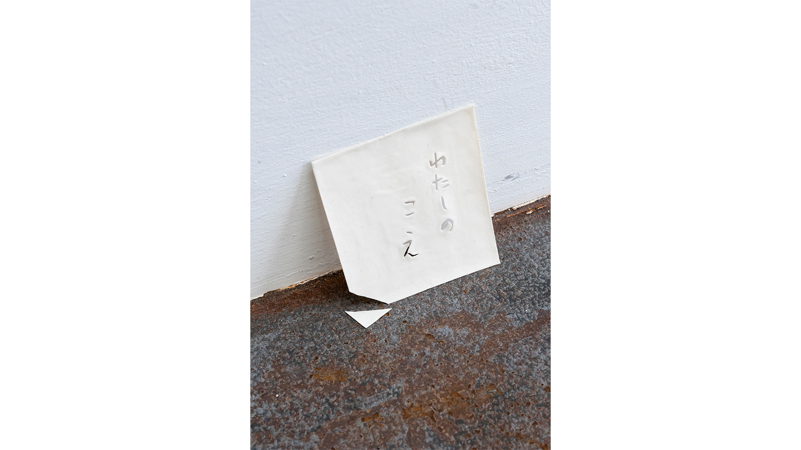 谷澤紗和子の「ちいさいこえ」は、陶紙で作られた小さな「プラカード」だ。歴史のなかでかき消されてきた声を可視化しながら、対峙する者の「力」や「大きさ」を問う作品である。本展ではこのほか、美術史において周縁化されてきた切り紙の手法を用い、女性の表現者の先達たちと仮想の対話を試みた「はいけいちえこさま」シリーズや新作インスタレーションも発表される。