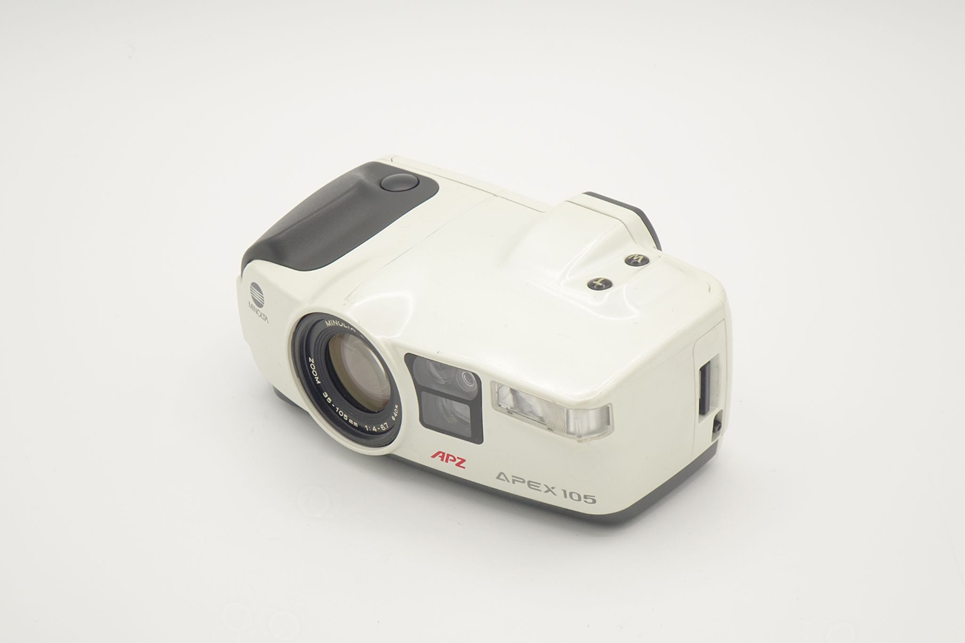 そしてキヤノンと同様、バリバリにAF一眼レフカメラを作っていながらもこのジャンルに参入したのがミノルタである。1990年9月に発売されたAPEX105は、3倍ズームを比較的シンプルなオペラグラス的箱形デザインに収めて登場した。これまでに取り上げてきたカメラが基本的にどれも非常に凝った造形だったのを考えるとだいぶクリーンなデザインだが、検討初期のデザインスケッチを見る限りでは曲面を多用し、レンズの存在感を出したデザインなどを検討しながらも、最終的にはこのような比較的シンプルな造形に落ち着いたようである。