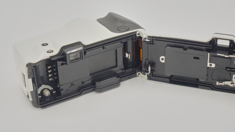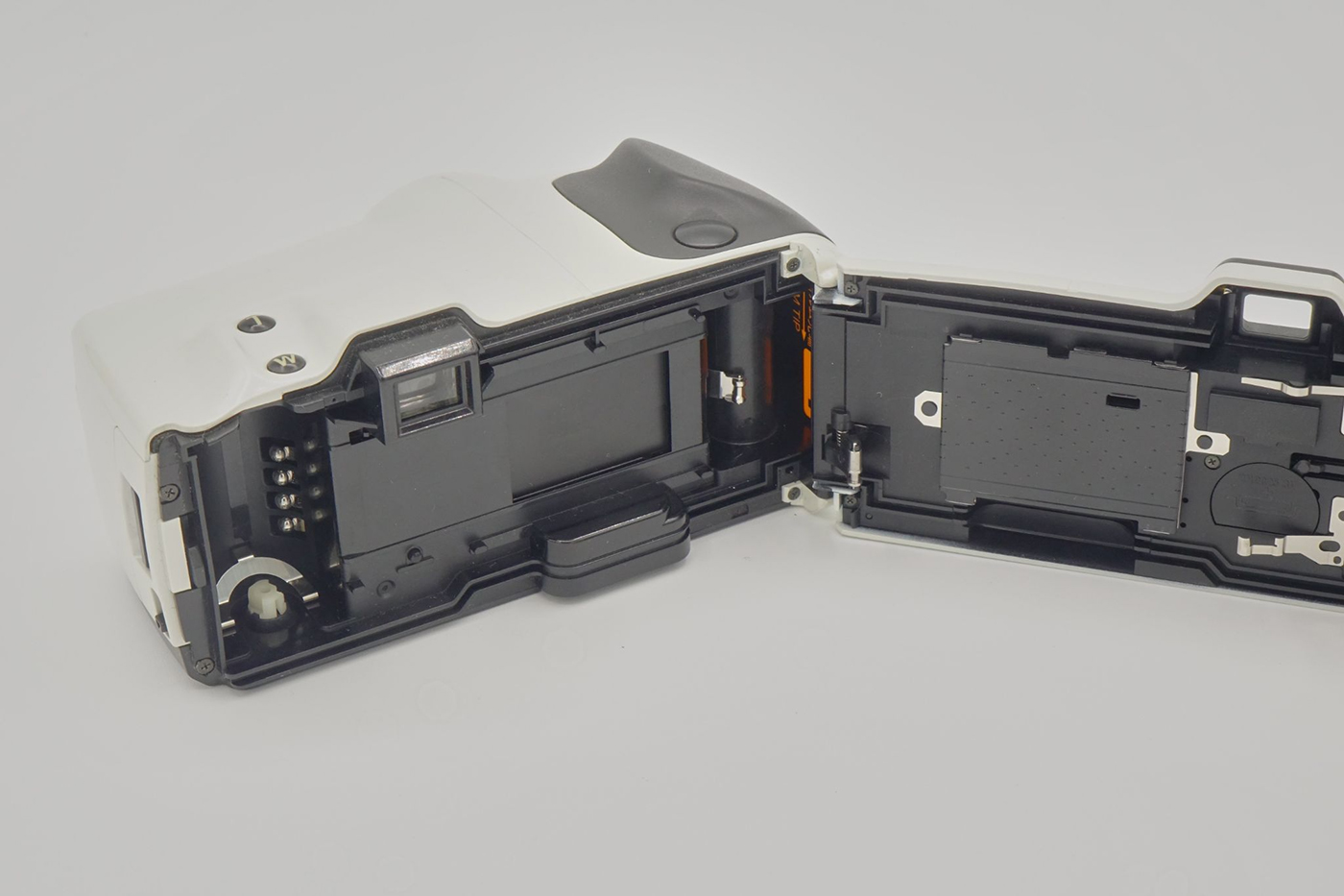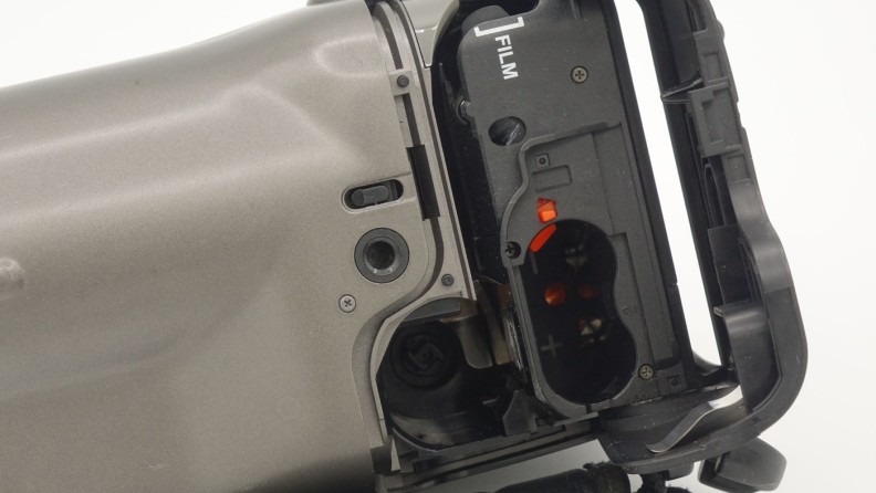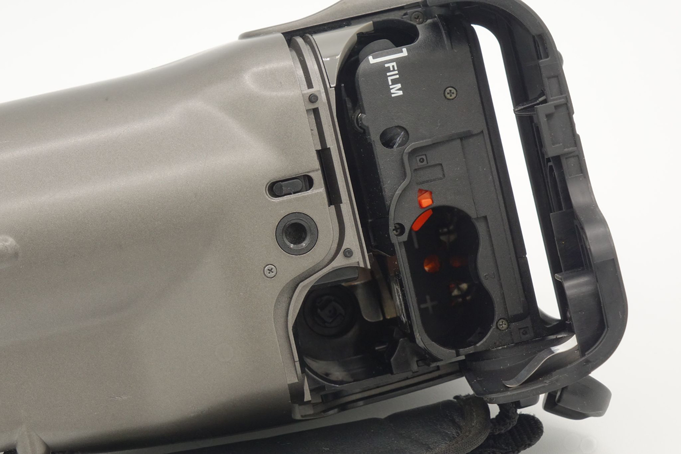 なお、オートボーイJETでは筒型フォルムでドロップイン式のフィルム給装を実現したが故に電池はパトローネ室の後ろに置かざるを得ず、裏蓋を開けたところに電池が鎮座している。しかしそれでは撮影中に電池が切れた時、裏蓋を開けたら感光してしまうし、かといって完全に電池が切れたら途中巻き戻しすらも出来なくなる……ということで、裏蓋に更に電池部分をくり抜いたフタを設けてあり、裏蓋を開けずとも電池だけ取り外せるようになっている。この泥縄的な解決方法はなんともキヤノンらしくないというか、もうちょっとどうにかなんなかったのだろうかとこれを見た全員がツッコむ部分であろう。