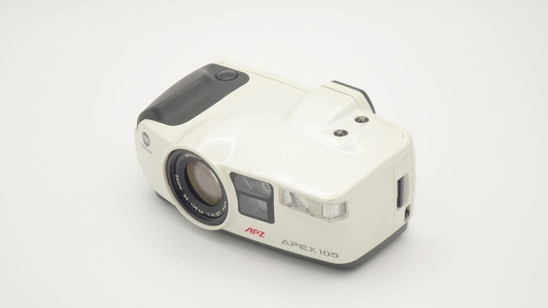 そしてこのカメラ、このような形をしているのに(このようなカメラでは定石の)外部AF式ではない。例えば本機と同様に「本体中央にレンズを持ち、横長で箱形に近い形状をしている」形状を持つオリンパスIZM300やリコーMIRAI Zoom3は外部パッシブAF搭載のカメラである。しかしAPEX105はそうではない。このカメラのAFは、当時のα-5700iと同じTTL位相差センサーなのである。改めてこのカメラの基本スペックを列挙すると「35mm・実像式ズームファインダー・3倍ズーム・レンズシャッター・TTL位相差式AF」ということになる。価格は64,000円である。