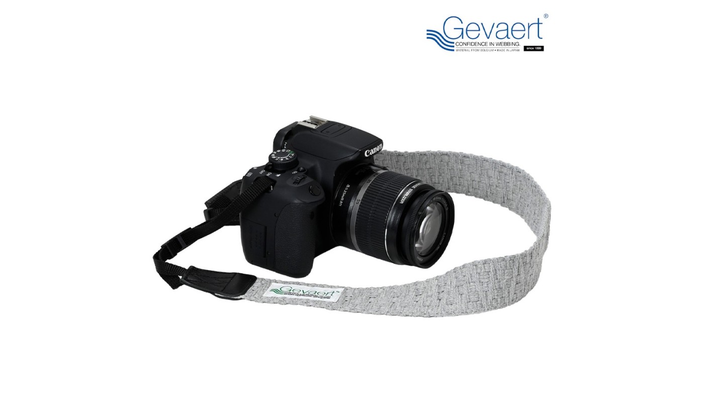 そんなゲバルトの生地を本場ベルギーから生地を直輸入し、日本の職人の手により、高品質でファッショナブルな一眼レフカメラ用ストラップに仕上げた。デジタル一眼レフ、ミラーレスカメラに魅力的な演出を提案する。本製品はGRS認証リサイクル原料を使用している。