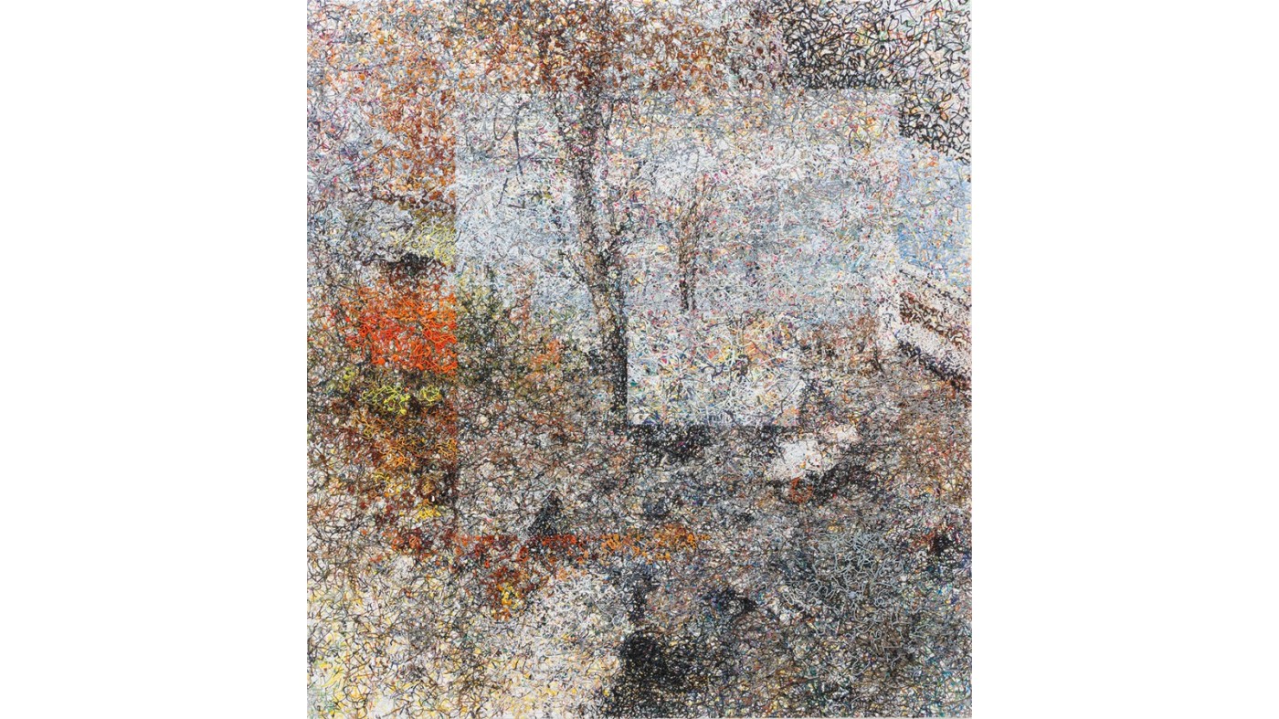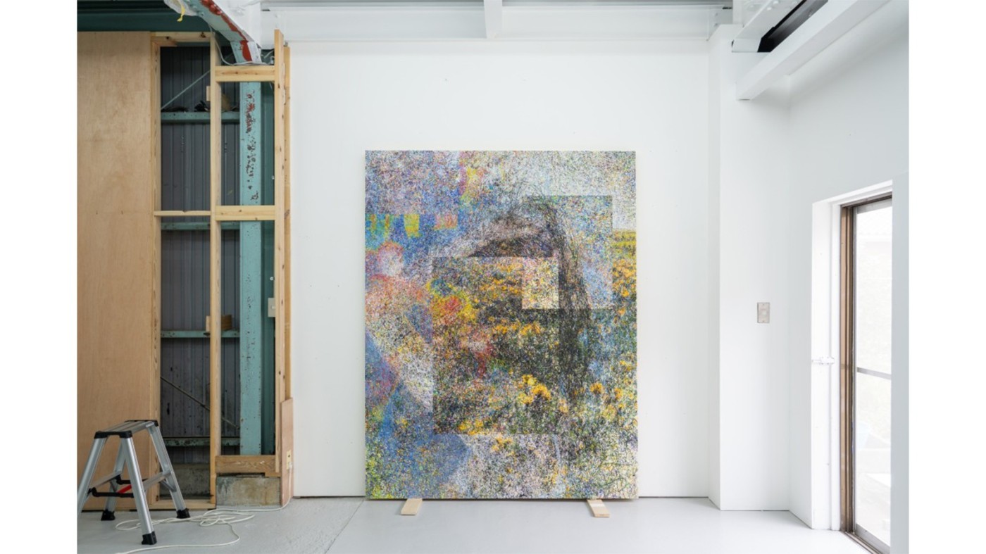 荒井理行の制作は、キャンバスに貼られた写真の外側を想像するところから始まる。シリンジ(注射器)から注出される絵の具は、幾つもの層となって画面に定着し、やがて複合的な1枚のイメージへと変容していく。