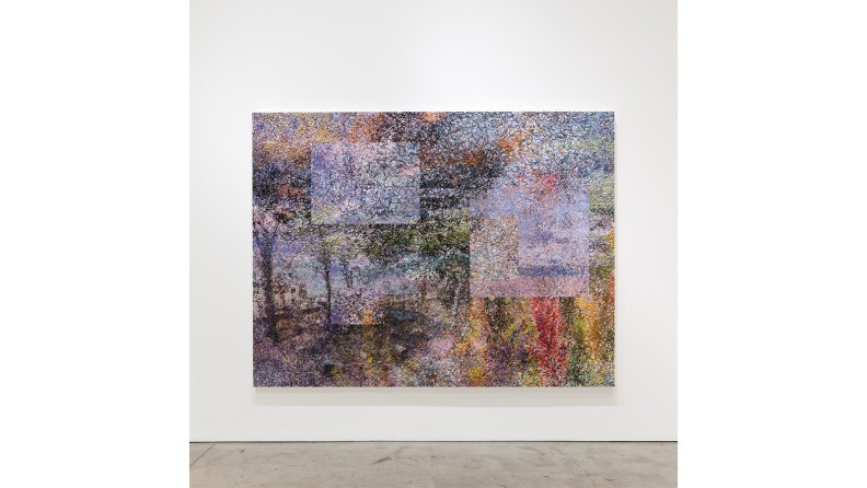 注射器で絵具を落として構成される多層的な画面は、現実と仮想、偶然と意図の境界を横断し、絵画を変容し続ける開かれた場として立ち上げている。