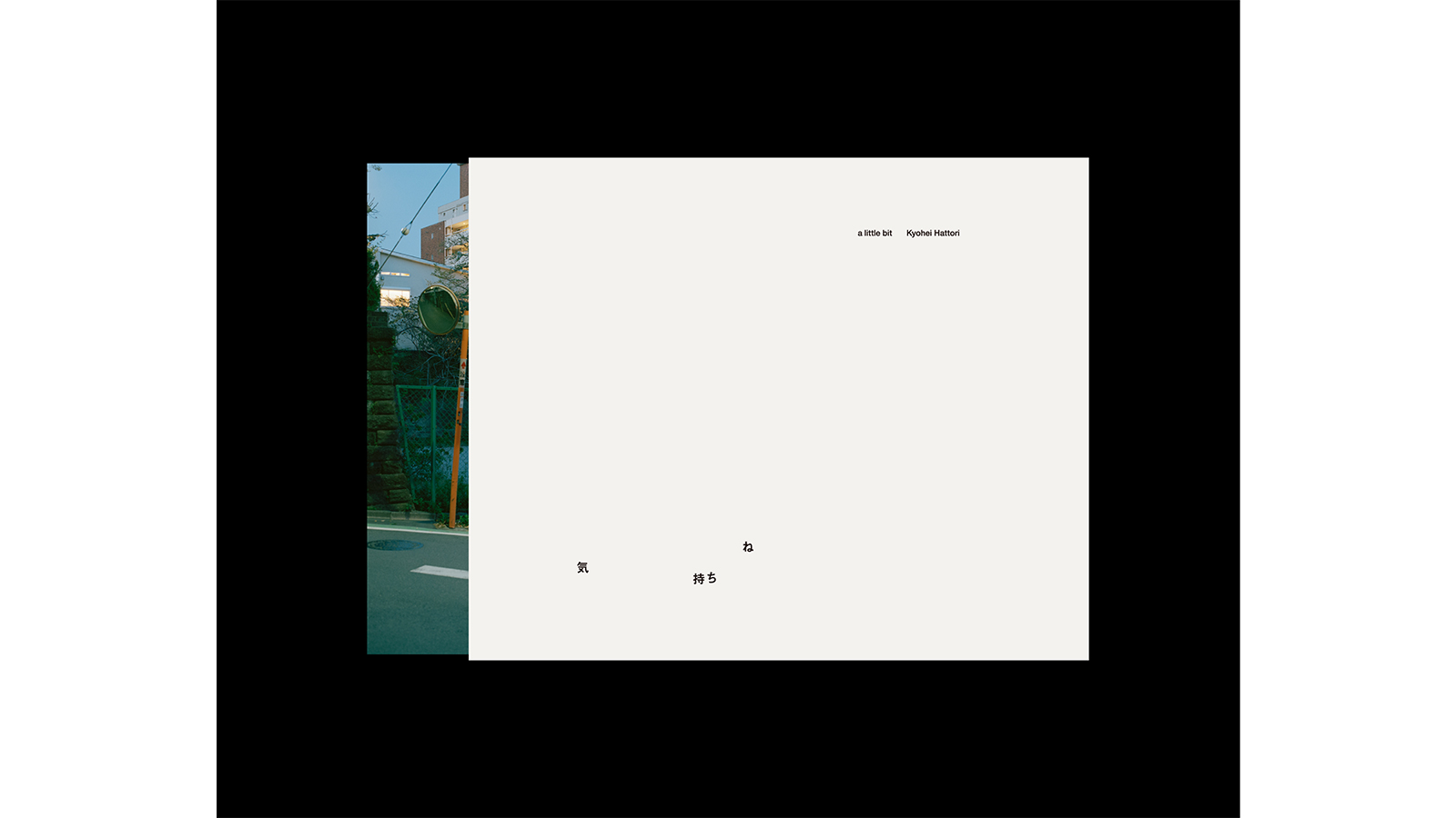 2025年、服部恭平は服部恭平写真事務所を構えた。独立して初めて写真集を刊行する。デザインは岡本太玖斗。巻末の文章は小原晩。どちらも服部が敬愛するクリエイターだ。彼の作品にテーマはない。だからと言って彼の写真は案外行き当たりばったりではない。画角を決め、カメラを構えてシャッターを押す。テーマを設けないということは、服部にとって大事な写真(その時間)との向き合い方であり、写真を撮ることが好きであるということに正直でありストイックでいたいからだという。そんな写真のかたまりがこの作品集になった。タイトルは「気持ちね」。