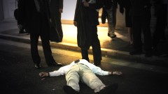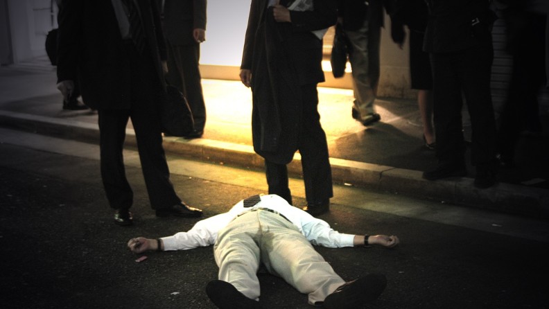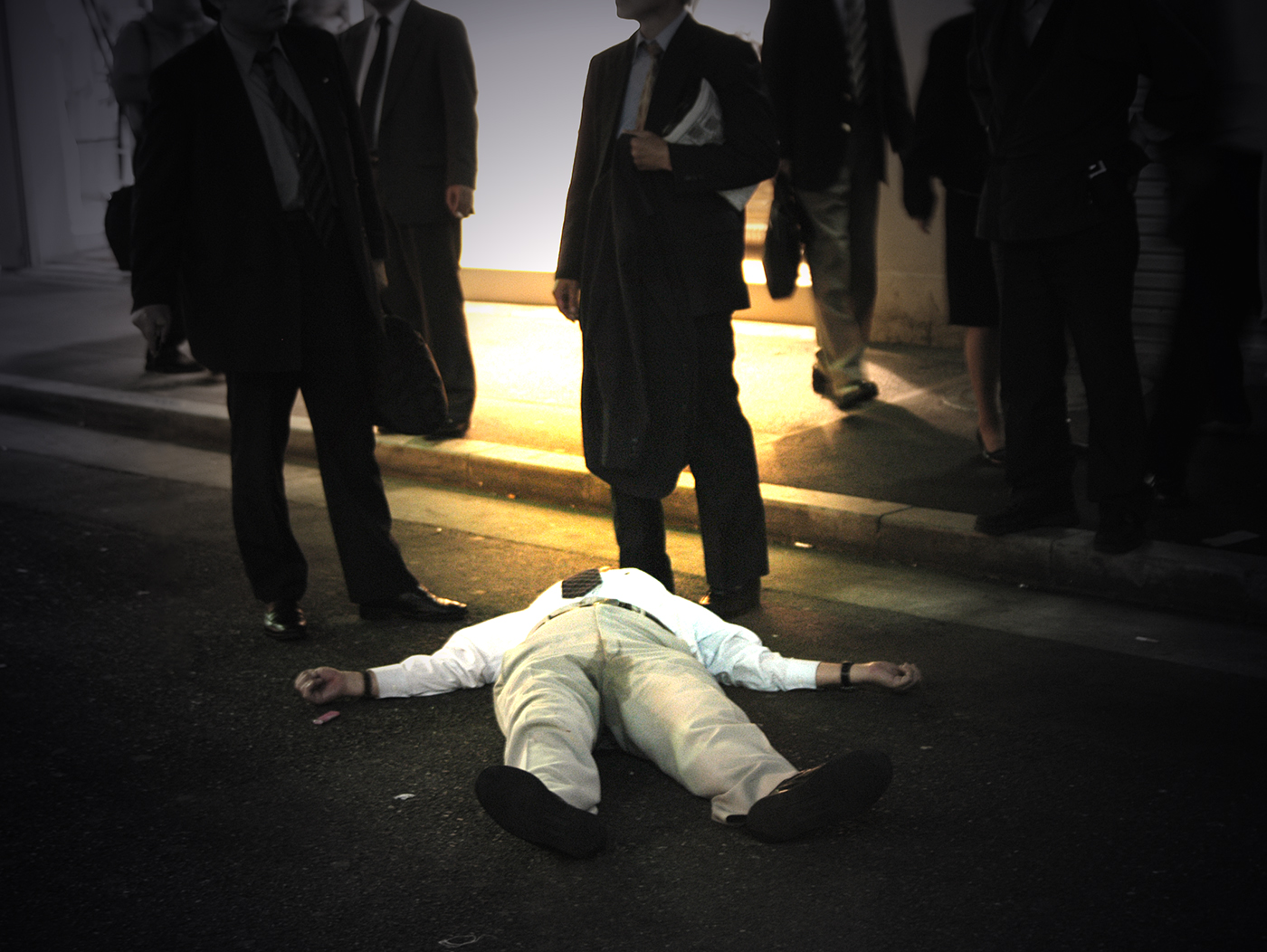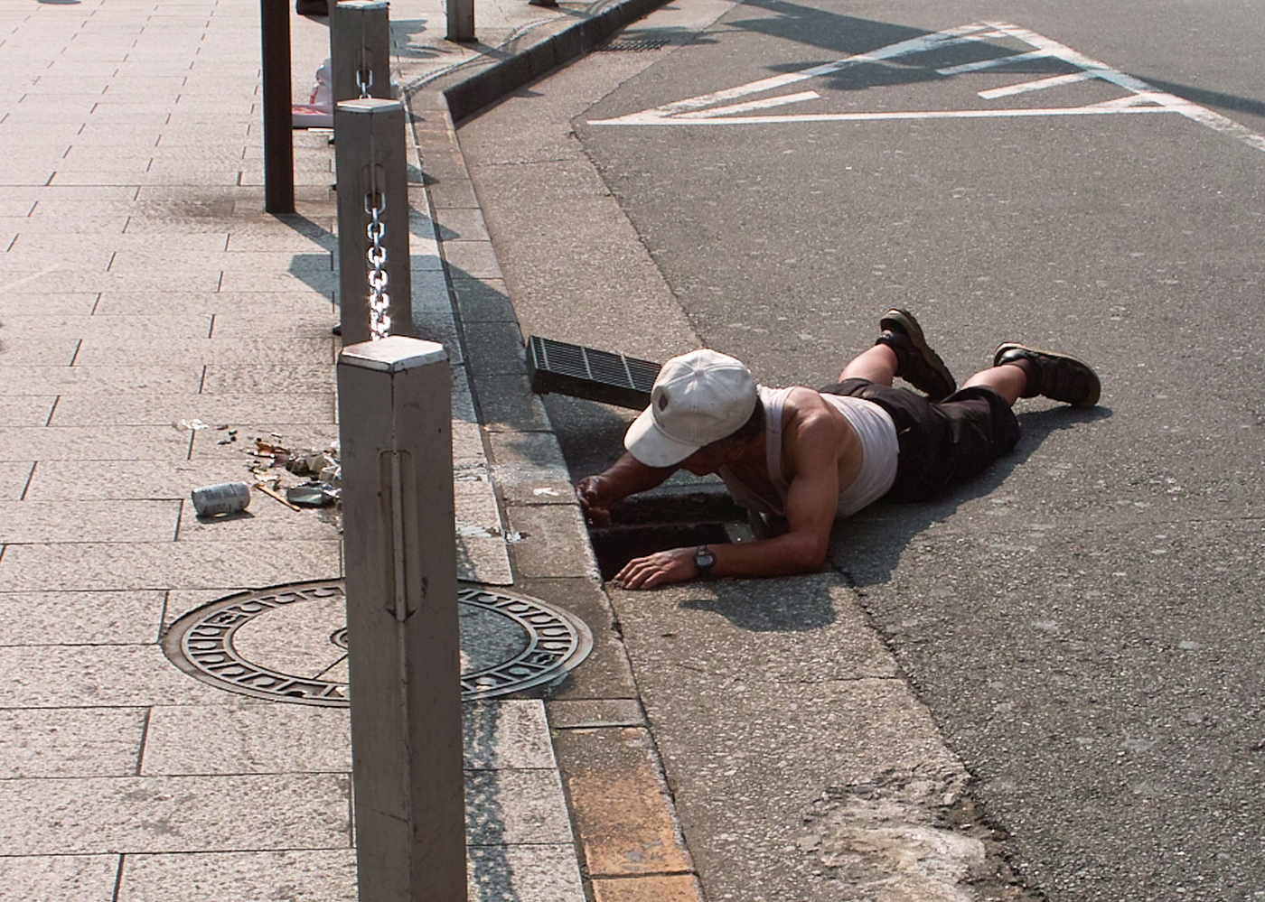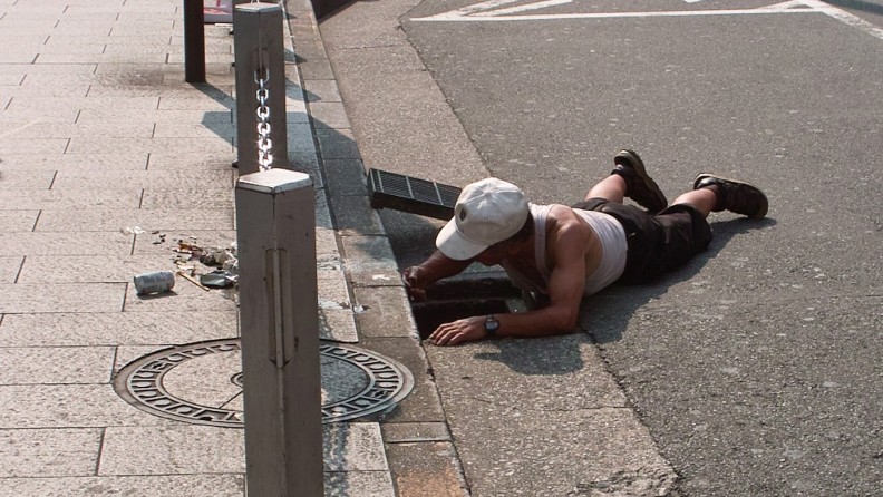 場所が凄いですよ。旧新宿アルタの向かい側。車道に身体を投げ出しているけど、車平気なのって状態。自分が落とした硬貨を拾っているわけではなくて、「落ちていないかな?」って願望で探しているんでしょうな。