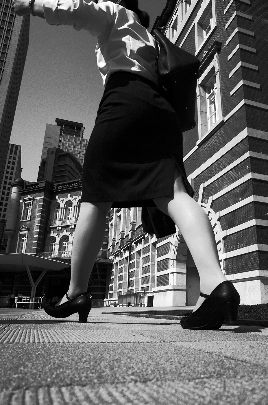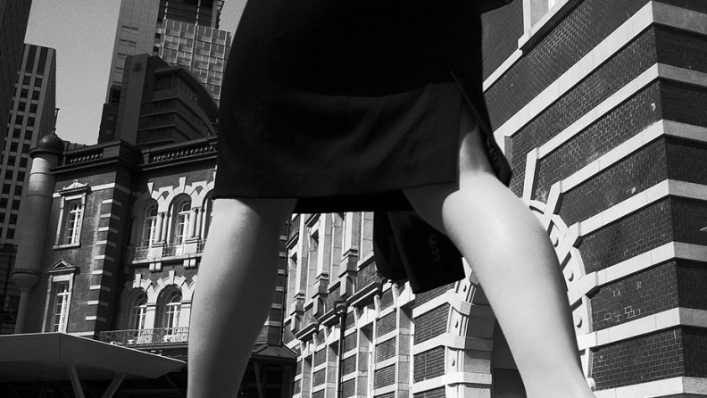 まずTOP(①)の写真だが、これは拙著『町の残像』(日本カメラ社)の中でも紹介しているが、あたしがローアングルで東京駅の駅舎を狙っていたら、女性が偶然眼の前を横切った、という予期せぬ写真である。普通、地面すれすれでカメラを構えていたら、眼の前を通らないと思うんですけどね。しかし被写界深度もバッチリで、よくこれが撮れましたよ。
