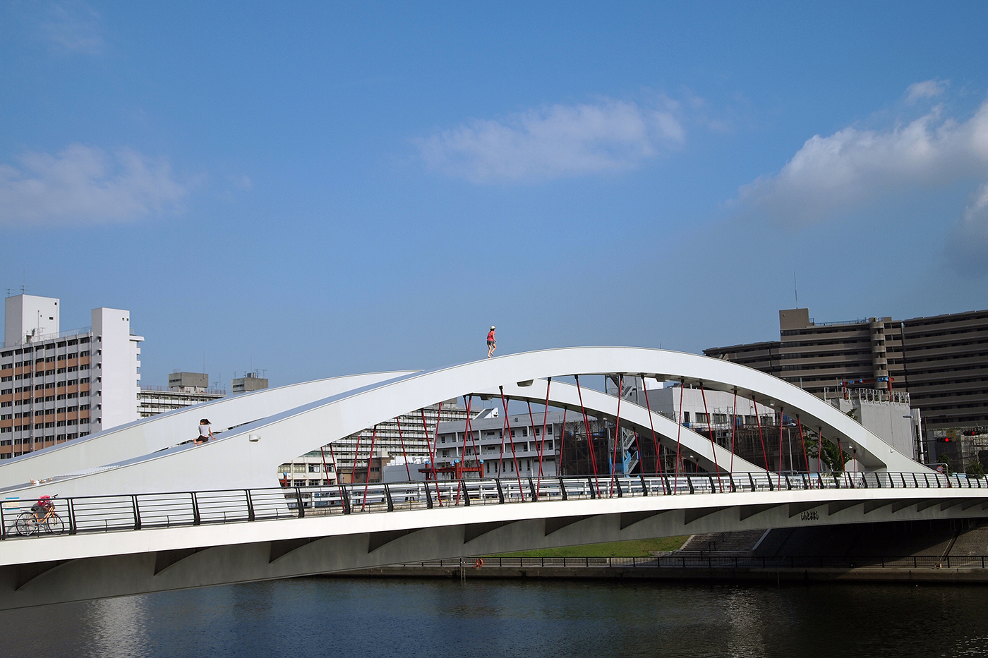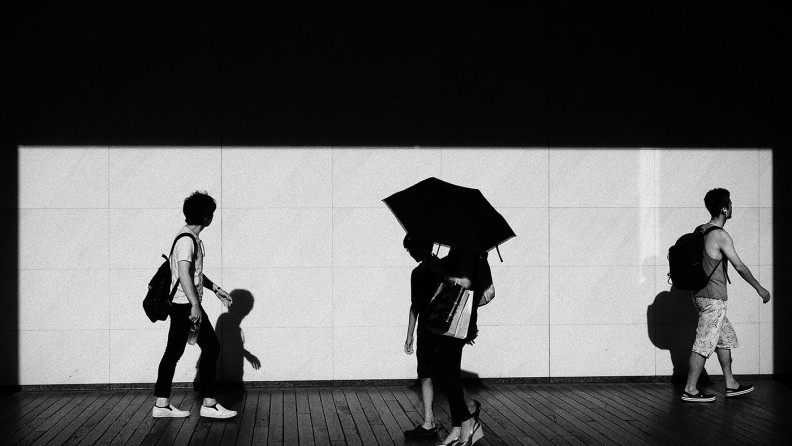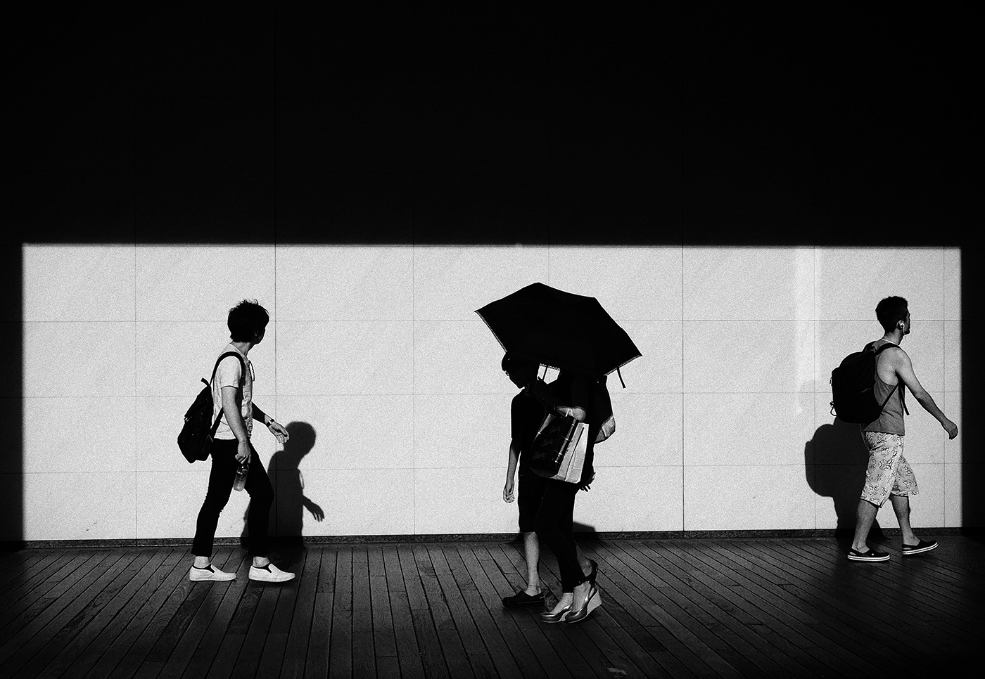 (②)の写真も白い壁にカメラを向けていたら、見事なアングルで3人が横切ったという意図としない写真であるが、自分で言うのもなんだが見事な写真である。写そうという意思があったのなら、壁に正対するんですがね。いかんせん偶然ですので、壁に対して真っ直ぐではないのが残念。この①と②はCP+のトークショウで紹介した写真である。