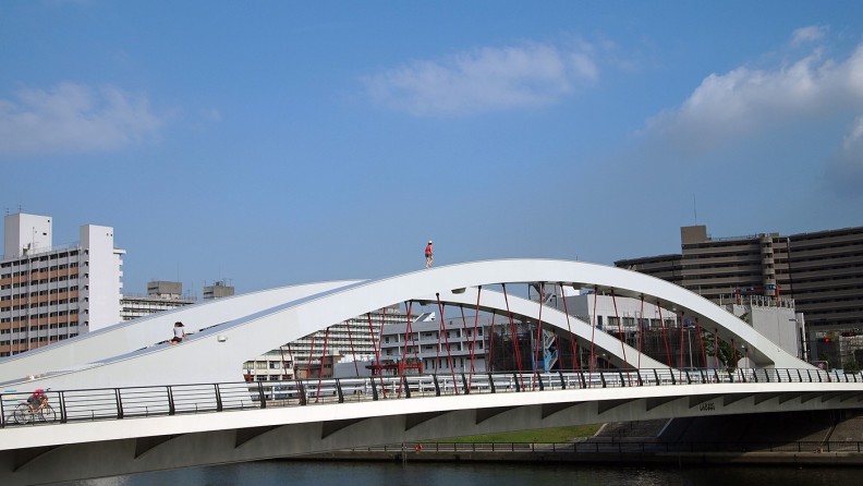 (⑤)は隅田川にかかる新豊橋(しんとよはし)。北岸は東京都足立区新田(しんでん)、南岸は北区豊島ということで、両岸の地名にちなんで新豊橋。2007年(平成19年)3月24日に開通で、この写真を撮った時にはすでに開通しているわけである。「ただの橋の写真じゃないか。この橋がどうかしたのか?」ですって? よく見て下さいよ、橋の上を……。アップの写真で見てみましょうか(⑥)。
