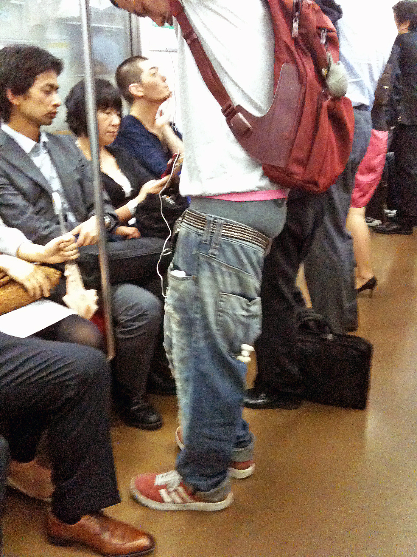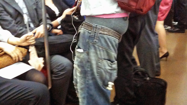 ギャングファッションでもないし。一時若者がズボンを腰骨の下で履くのが流行った。だらしなくてみっともなかったが、あれがギャングファッション。アメリカで刑務所に入る時、自殺防止等の理由でベルトを取り上げられる。そんでもってズボンがずり下がる。それがギャングファッションと呼ばれ、日本にも飛び火してきて若者が模して、だらしないズボンの履き方が流行った。このズボンを腰骨の位置で履くファッションスタイルが「腰パン」とも呼ばれた。日本の若者はわけも分からずアメリカの真似をしていた。しかしこの若者のズボンは腰パンではなかろう。それとも腰パンなのかな? この半ケツが腰パンだったら、最低だな。