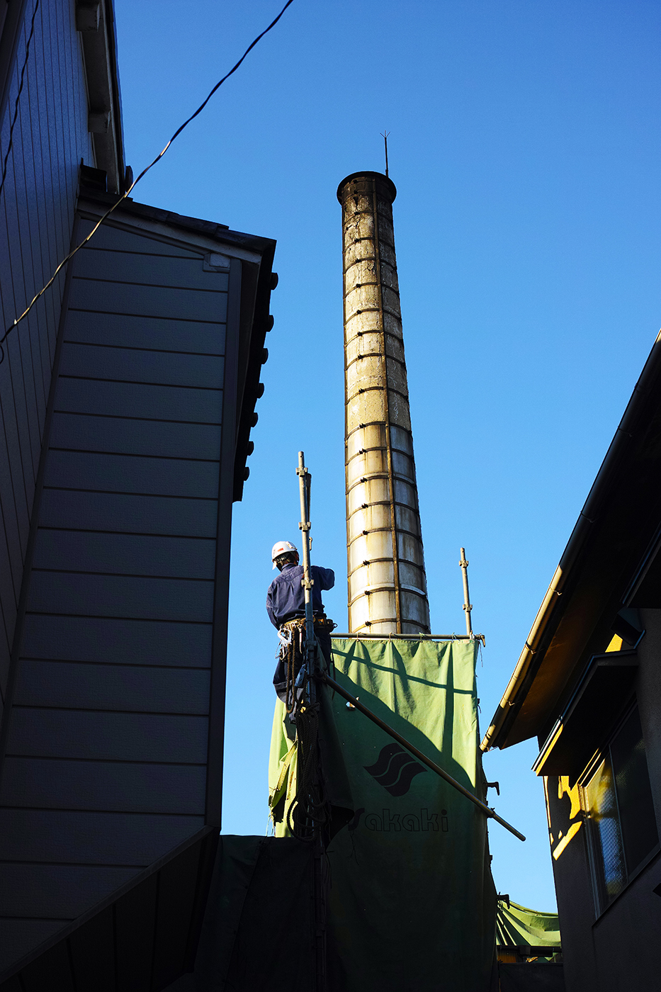 そして(⑧)の写真だが、銭湯だと思うが煙突の解体作業である。あたしはそれまで煙突を建てる時の様子も解体する時の様子も見たことがなかったので、しばし足を止めて眺めていた。