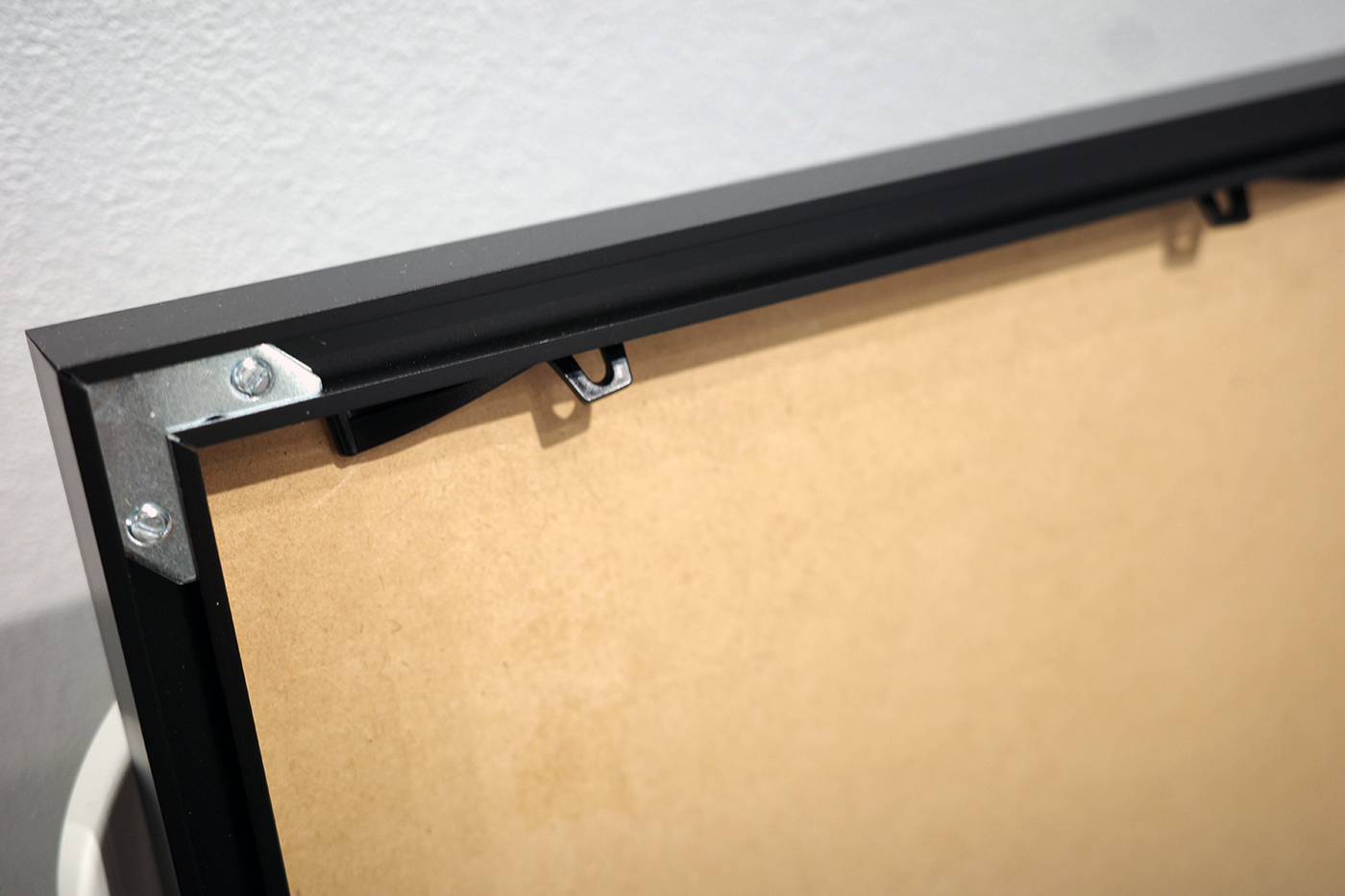 「極シリーズ」の額の後ろが、溝になっているのがおわかりでしょうか。ここにさきほどの釘をひっかけると、多少揺れてもびくともせず、しっかり留められます。