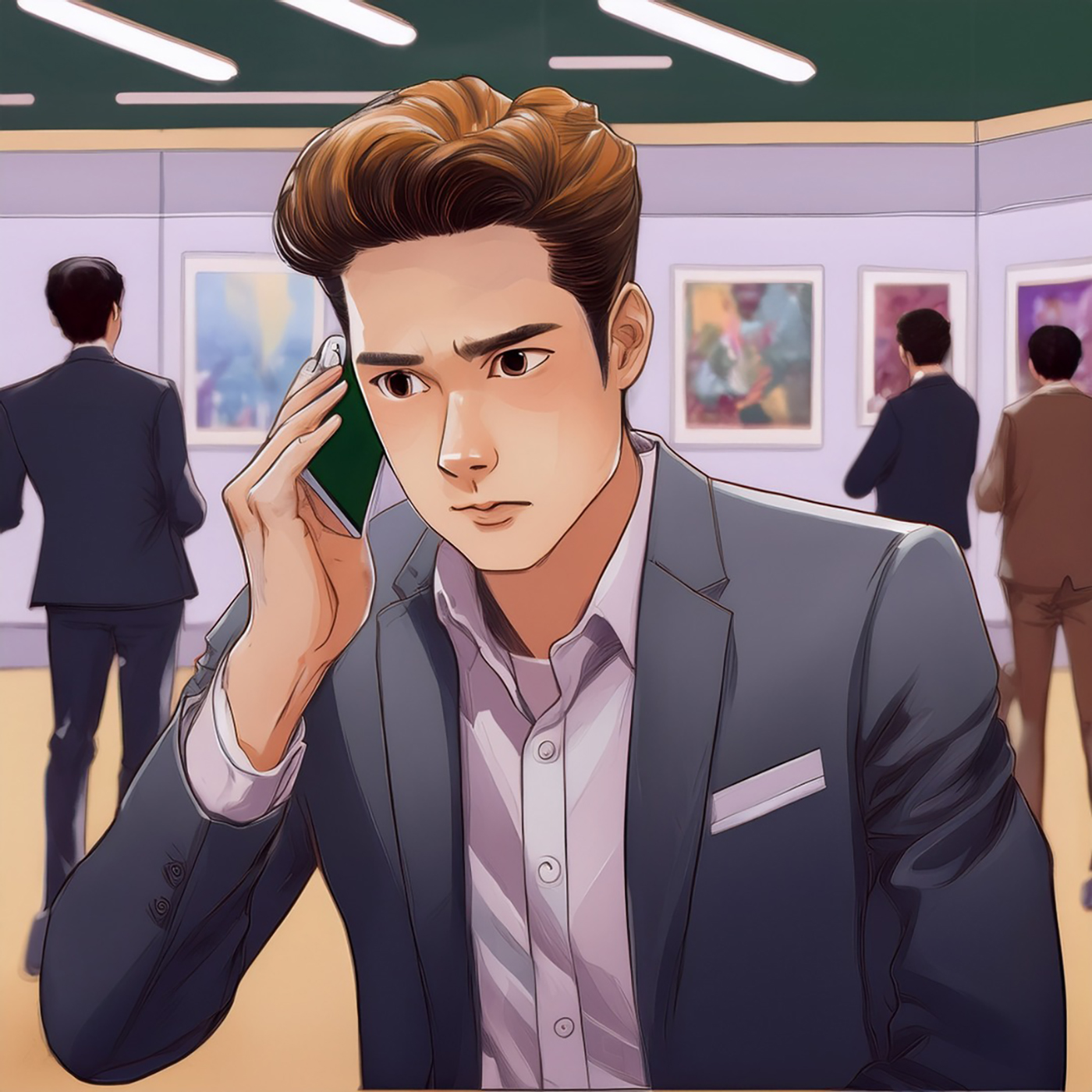 困った例の実例写真を上げるわけにはいかないので、「連絡がつかなくて困っている写真展の主催者の画像」をAIで生成してみました。