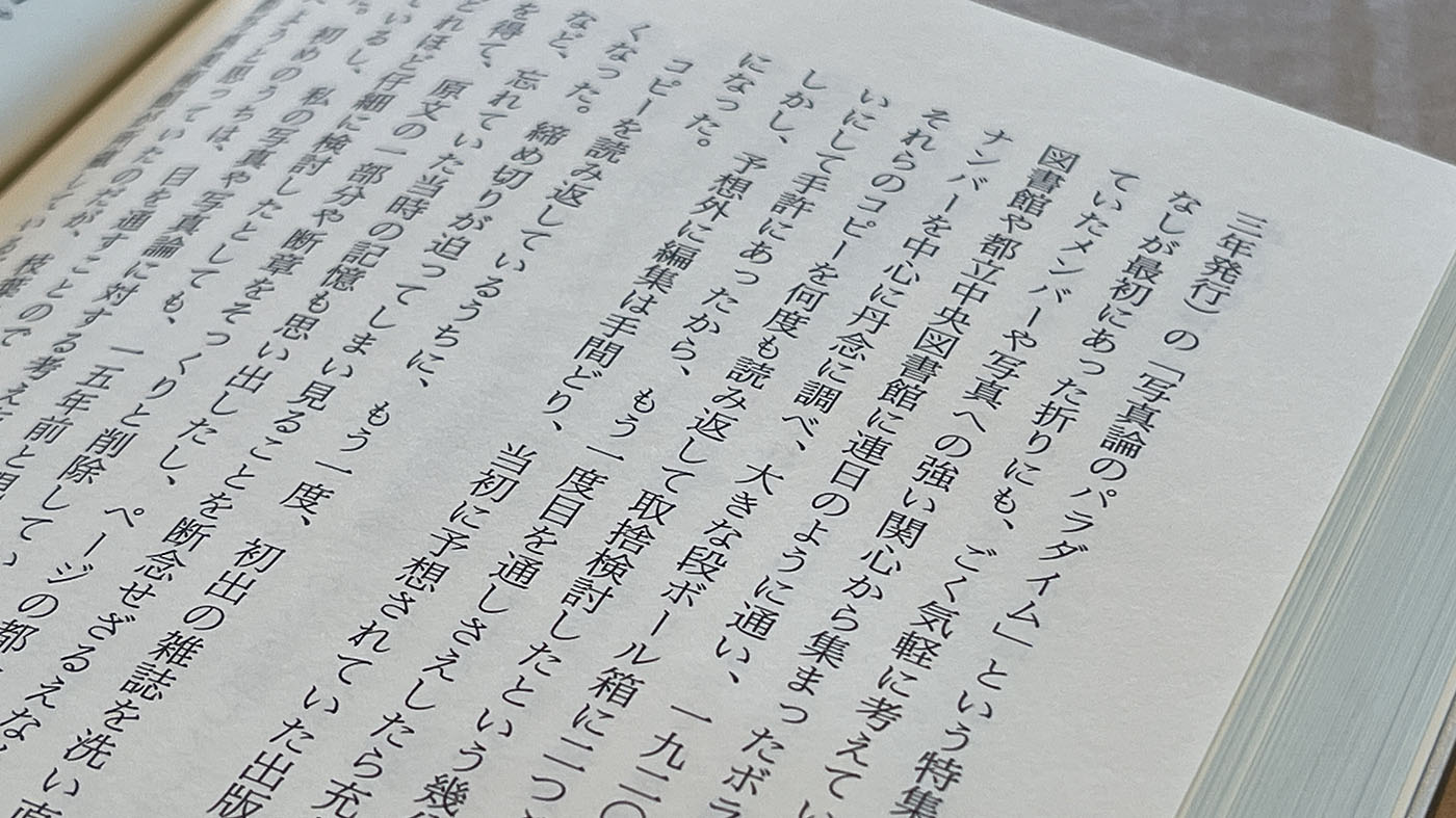 コピーを読み返しているうちに、もう一度、初出の雑誌を洗い直してみるべきだろうとの思いが強くなった。締め切りが迫ってしまい見ることを断念せざるえなくなった雑誌もかなりの数あったことなど、忘れていた当時の記憶も思い出したし、ページの都合で著者ご本人や著作権継承者の方の了解を得て、原文の一部分や断章をそっくりと削除しているものも幾つかあった。そして何よりも、当時どれほど仔細に検討したとしても、一五年前と現在とでは写真についての批評や思想の状況も変化しているし、私の写真や写真論に対する考え方だって当然同じであるとはいえないとの思いが強くなった。初めのうちは、目を通すことのできなかった雑誌とその欠落している時代とを中心に補足的に調べようと思っていたのだが、枝葉や飛び火のようにあれこれと新たな関心や疑問が湧き、結局は東京都写真美術館が所蔵している写真雑誌の大半に目を通すことになってしまった。