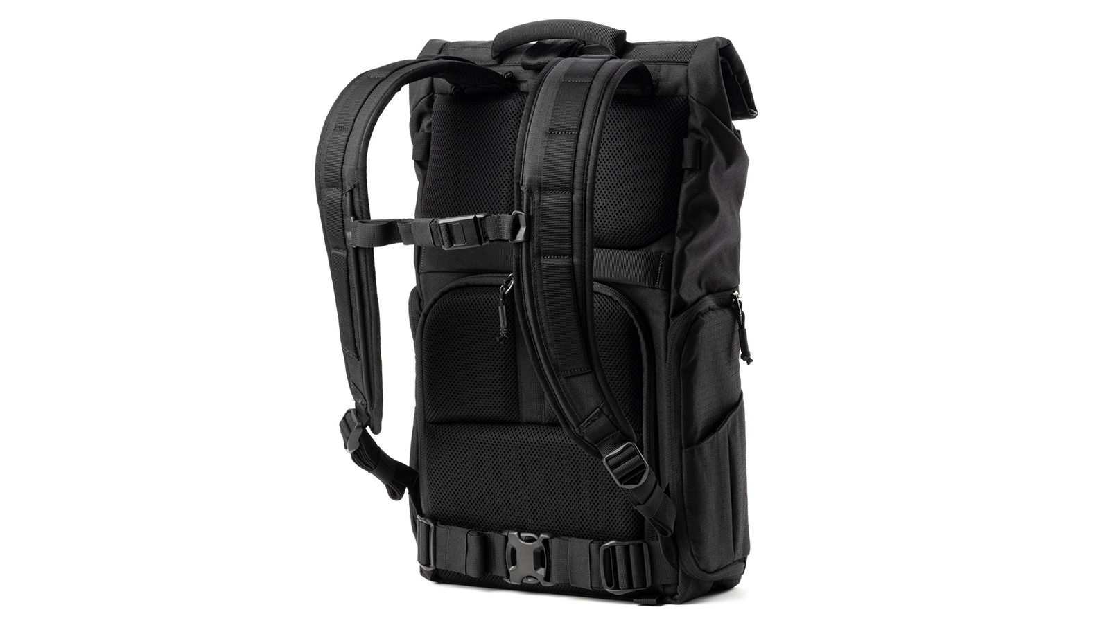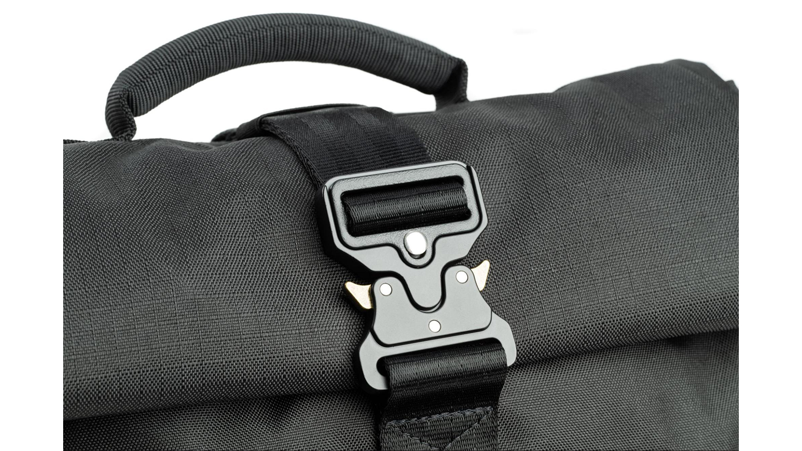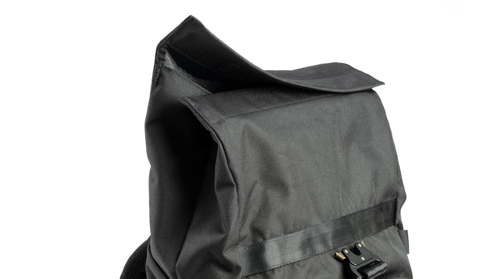 バッグの上部は容量を拡張できるロールトップ型で、ジャケットなど嵩張るアイテムの収納に最適。ロールトップ部分はマグネットによる開閉、またロール後はパラシュート式クイックリリースバックルでしっかりと固定でき、使い勝手と安全性を両立している。
