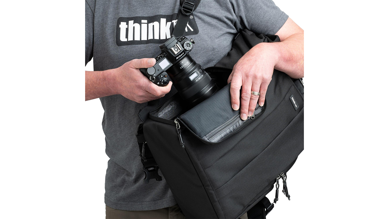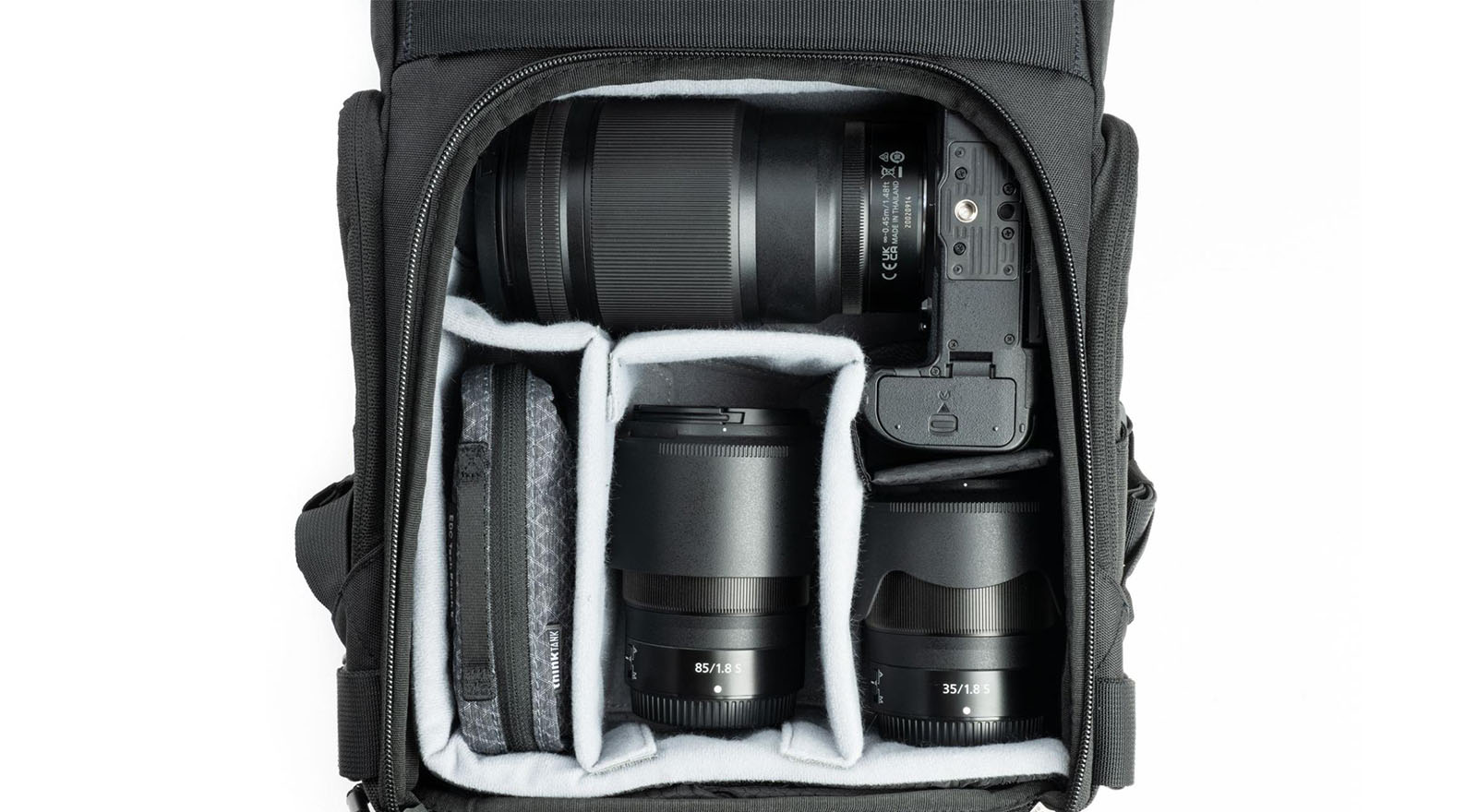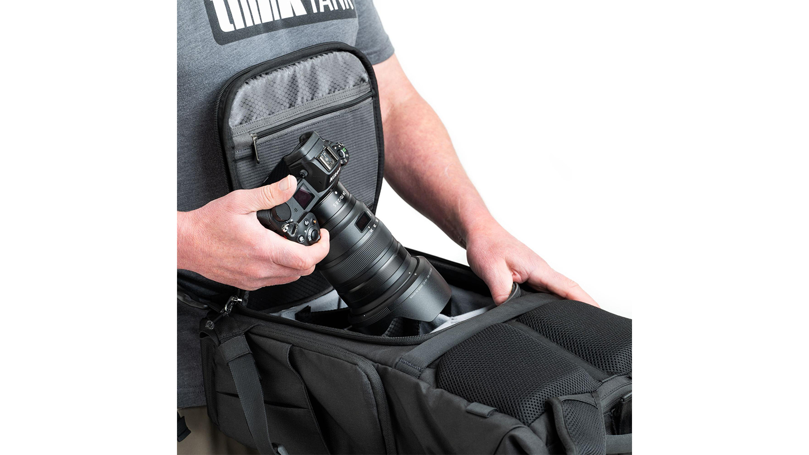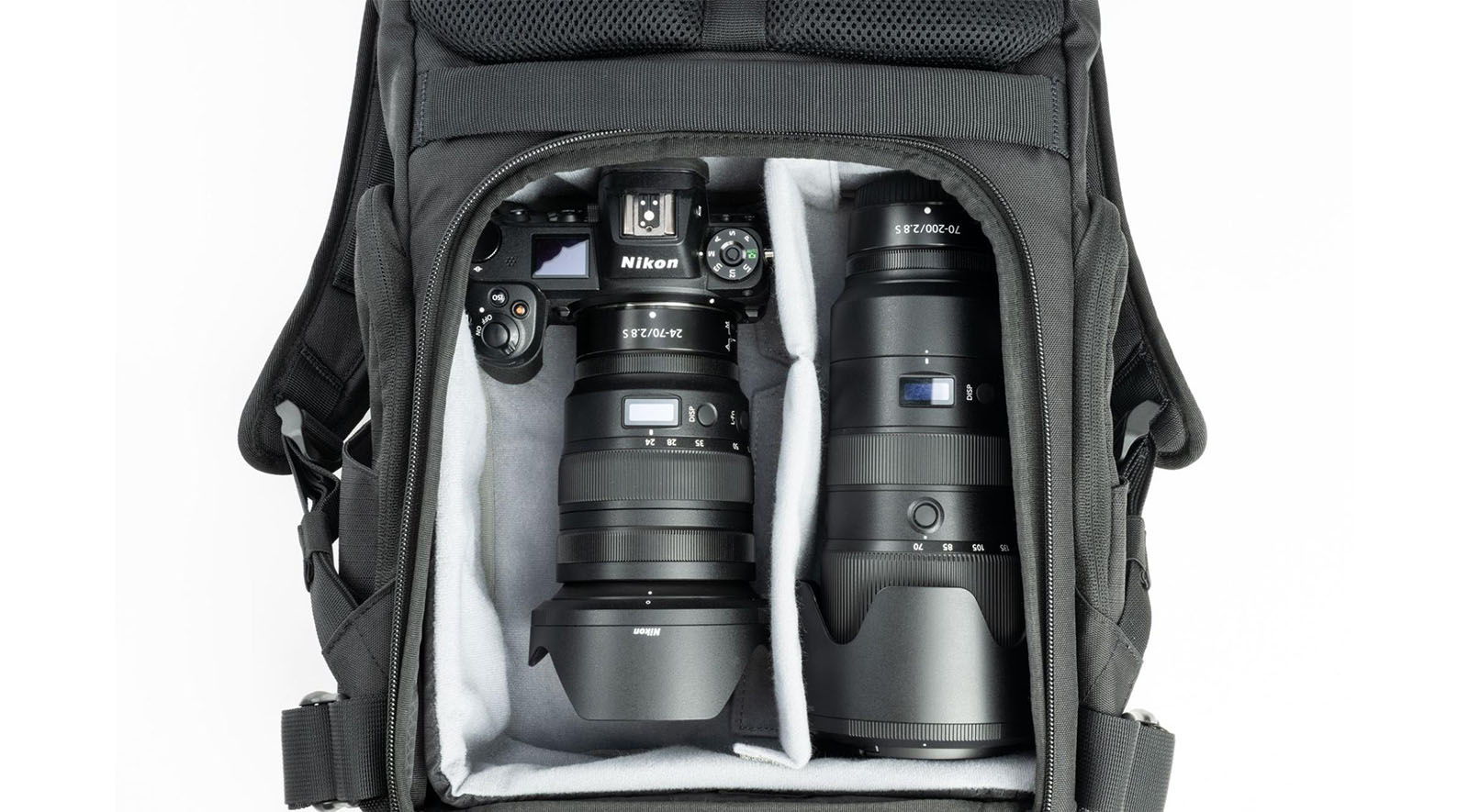 カメラを収納するメインコンパートメントにはクッション性のあるディバイダー付きのインサートが備えられており、機材を安全に収納できる。機材収納部のバックパネル、またサイドパネルからアクセスが可能で、バッグをおろさずに素早く機材を取り出せる。