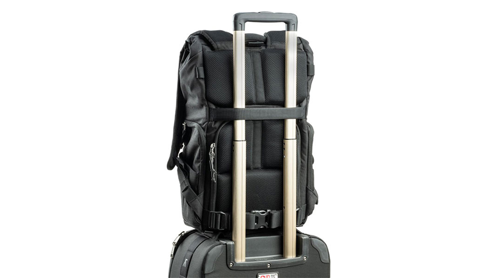 バックパネルには通気性の高いエアメッシュとクッションフォームを備え、快適な背負い心地を実現。また、背面にはパススルーを搭載。ローリングケースのハンドルに通して持ち運べるため、移動時の負担を軽減する。