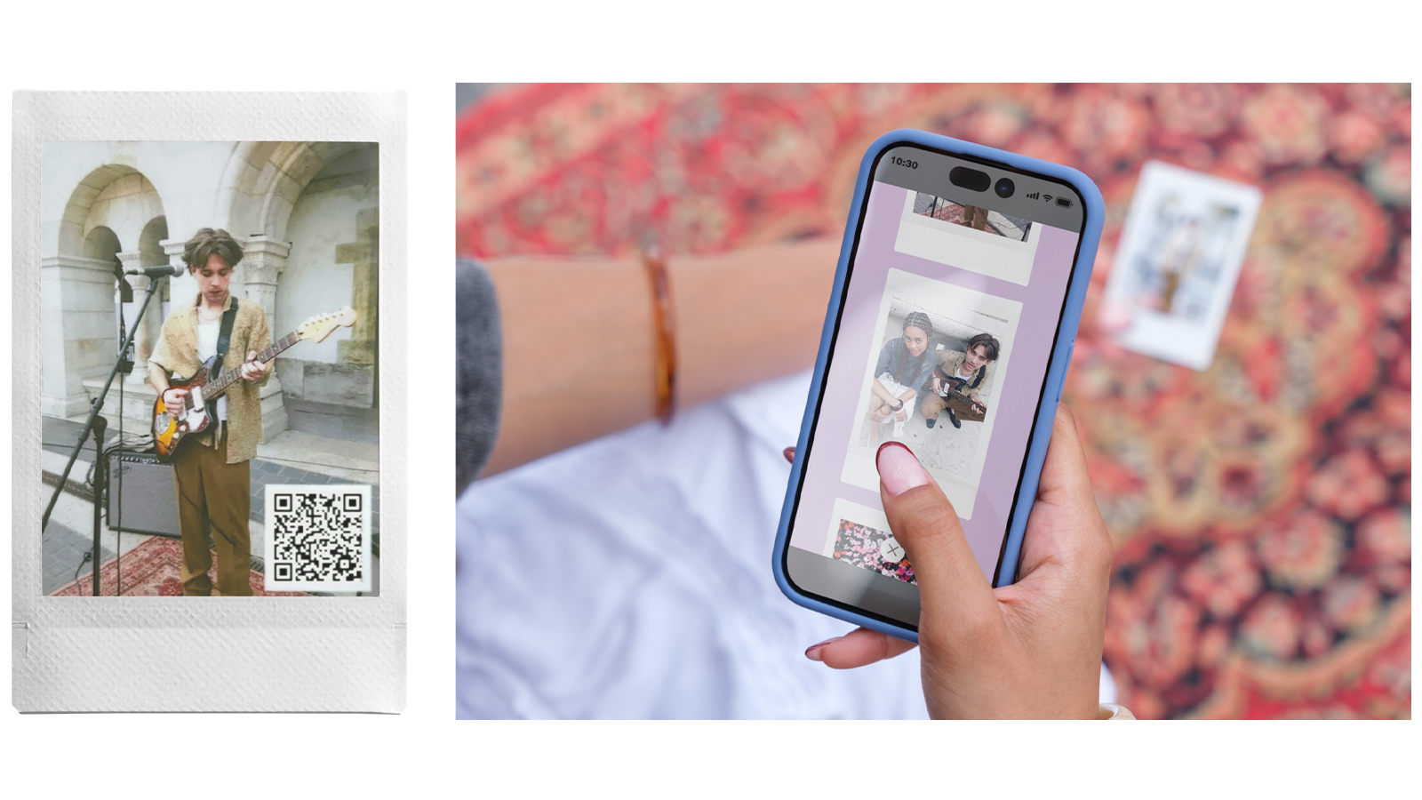 最大10枚の音付き画像から、背景やテーマに合うBGMを付けた最大30秒のスライドショー形式の動画を作成できる。作成した動画はQRコード化し、表紙に選んだ画像と一緒にプリント可能。QRコードはスマホのQRコードリーダーで読み取ることで、動画を再生・ダウンロードできる。一緒に過ごした思い出をいつでも見返せるチェキプリント™にして渡せば、贈る相手との繋がりが深まる。
