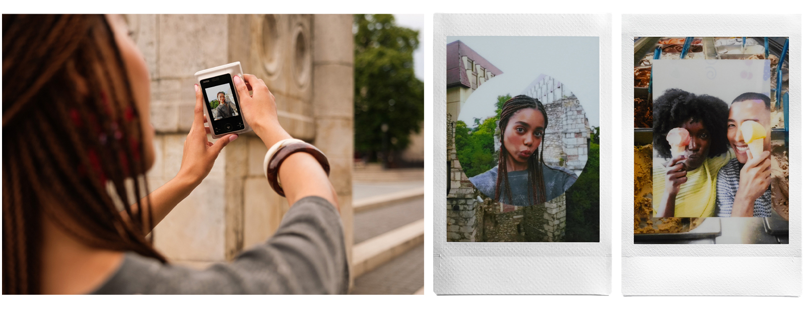 今回発売する「mini LiPlay+」は、「mini LiPlay」で好評を得ている機能に加えて、カメラ背面のモニターを確認しながら友達や家族と簡単にセルフィーができるようinstax™シリーズ初のインカメラ(以下、「セルフィーカメラ」)を搭載。さらに新機能「Layered Photo Mode」では、セルフィーカメラで撮影した自撮り画像を、メインカメラで撮影した風景画像に重ねてプリント可能。自撮りした表情とその場の風景を組み合わせることで、撮影した瞬間の感情や情景を鮮明に蘇らせる、思い出の詰まったチェキプリント™に仕上げる。