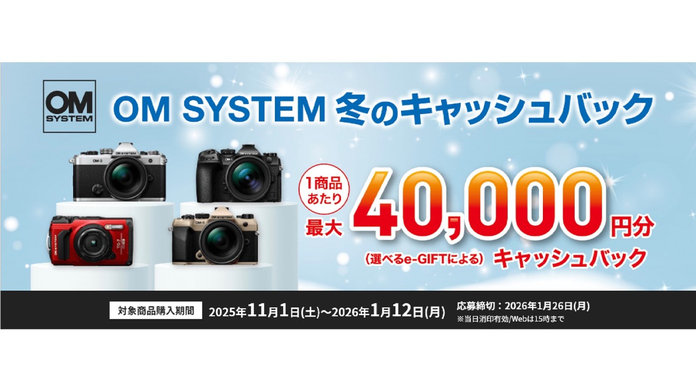 OM SYSTEMは、最大40,000円分をキャッシュバックする「冬のキャッシュバックキャンペーン」を開催する。