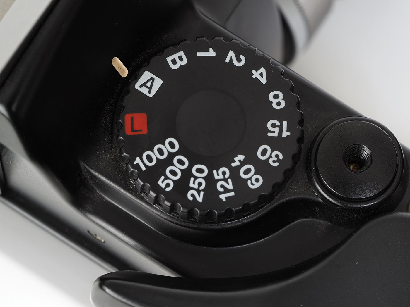 シャッターダイヤルの「A」ポジションは白色、ロックの「L」は赤色です。この色は逆じゃないのかなあ。でも、どうでもいいのか。シャッターダイヤルにロック機構はありません。