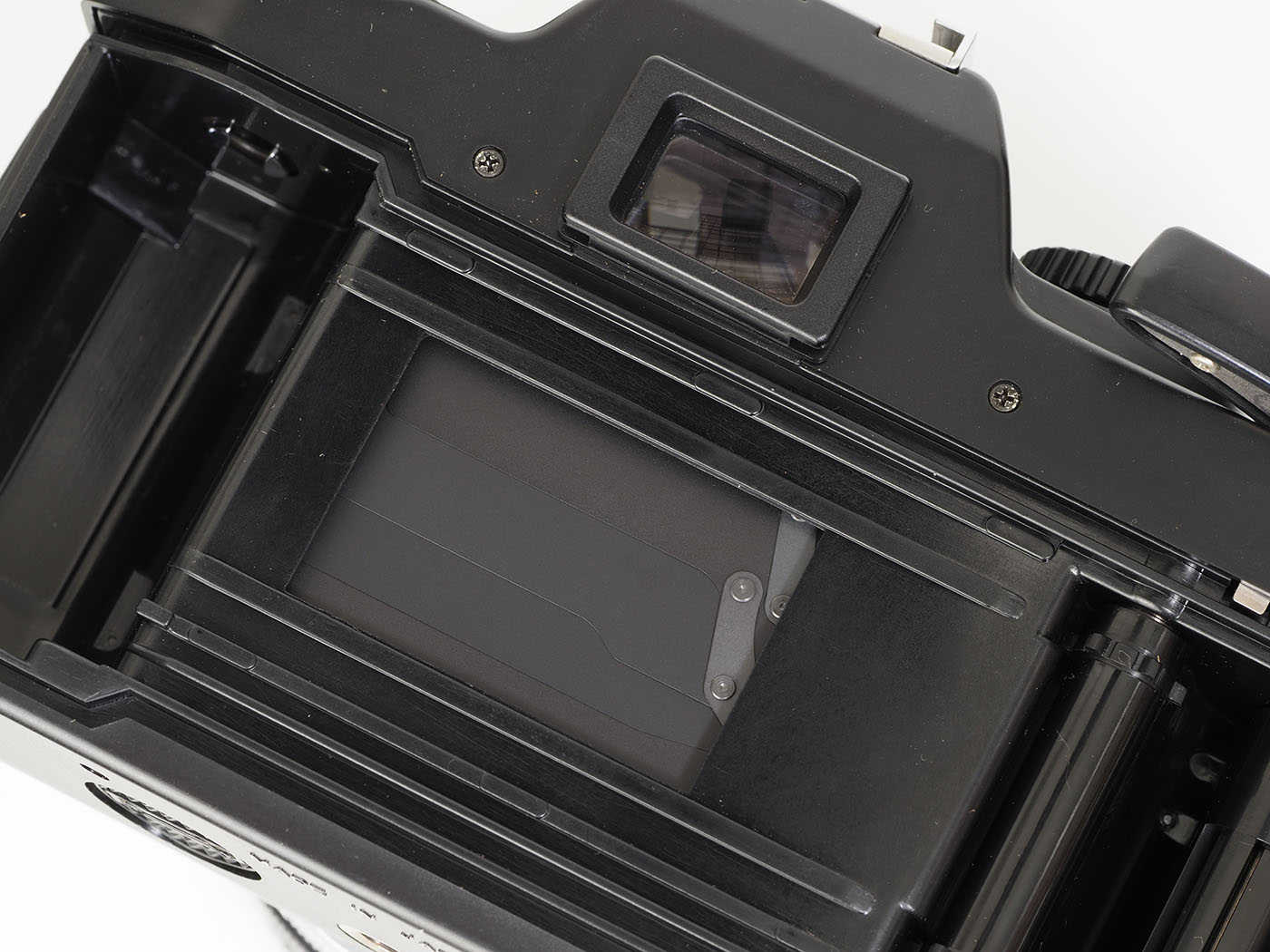 裏蓋を開いてみます。アパーチャー部やフィルムガイドレール等はフルプラスチックですね。実用上は問題ないのでしょうが、見た目ではさすがにむむ、となります。