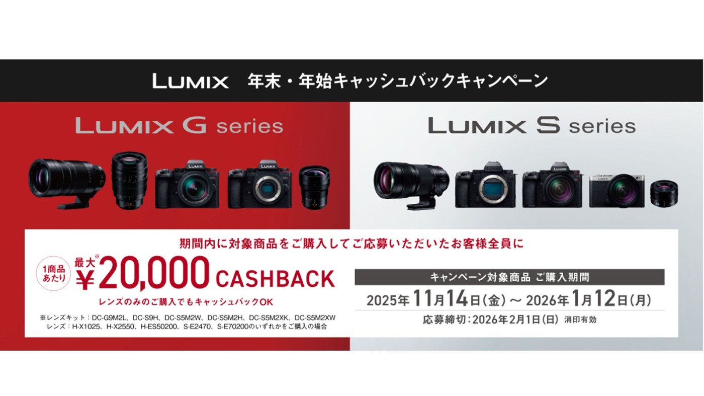 パナソニックは、「LUMIX 年末・年始キャッシュバックキャンペーン」を2025年11月14日より実施。