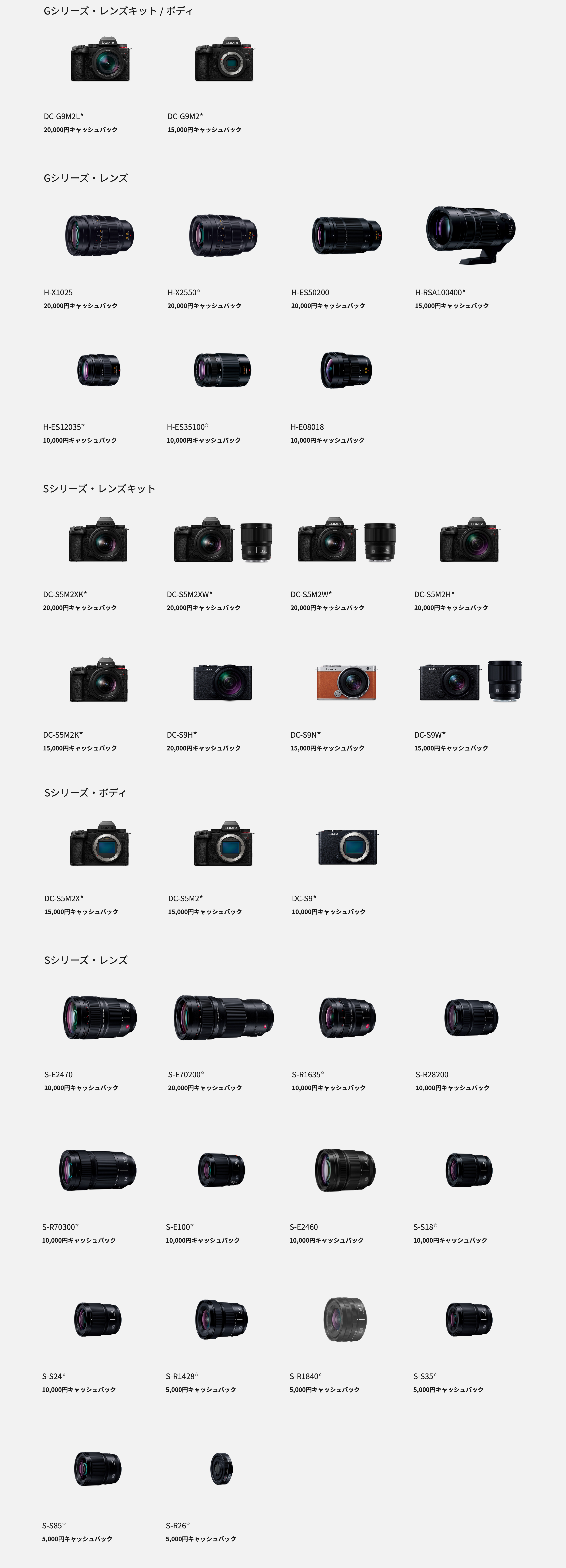 レンズキット:DC-G9M2L、DC-S9H、DC-S5M2W、DC-S5M2H、DC-S5M2XK、DC-S5M2XW レンズ:H-X1025、H-X2550、H-ES50200、S-E2470、S-E70200のいずれかを購入の場合