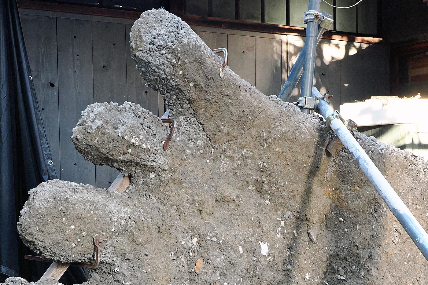 これこそ何のために置かれているのだろうか? よく見ると、指は折れないように、なのだろうか、クランプのようなもので止められており、また倒れないようにパイプで固定されている(⑫)。