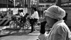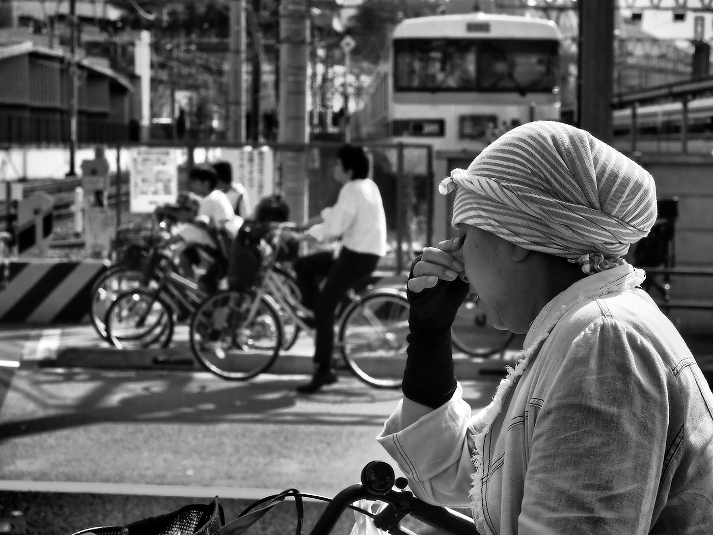 「そういえば、なぜかこの方向にはしばらく足を向けていなかった」と、景観の変わりようにも納得がいく。踏切があった頃と現在の場所を定点で比べたいのだが、この踏切の写真など撮っていないよな~、とあきらめる。待てよ、ここって以前、列車の通過待ちをしている猛暑の中の女性の写真を撮ったっけ。帰って探してみよう。それが(③)の写真である。