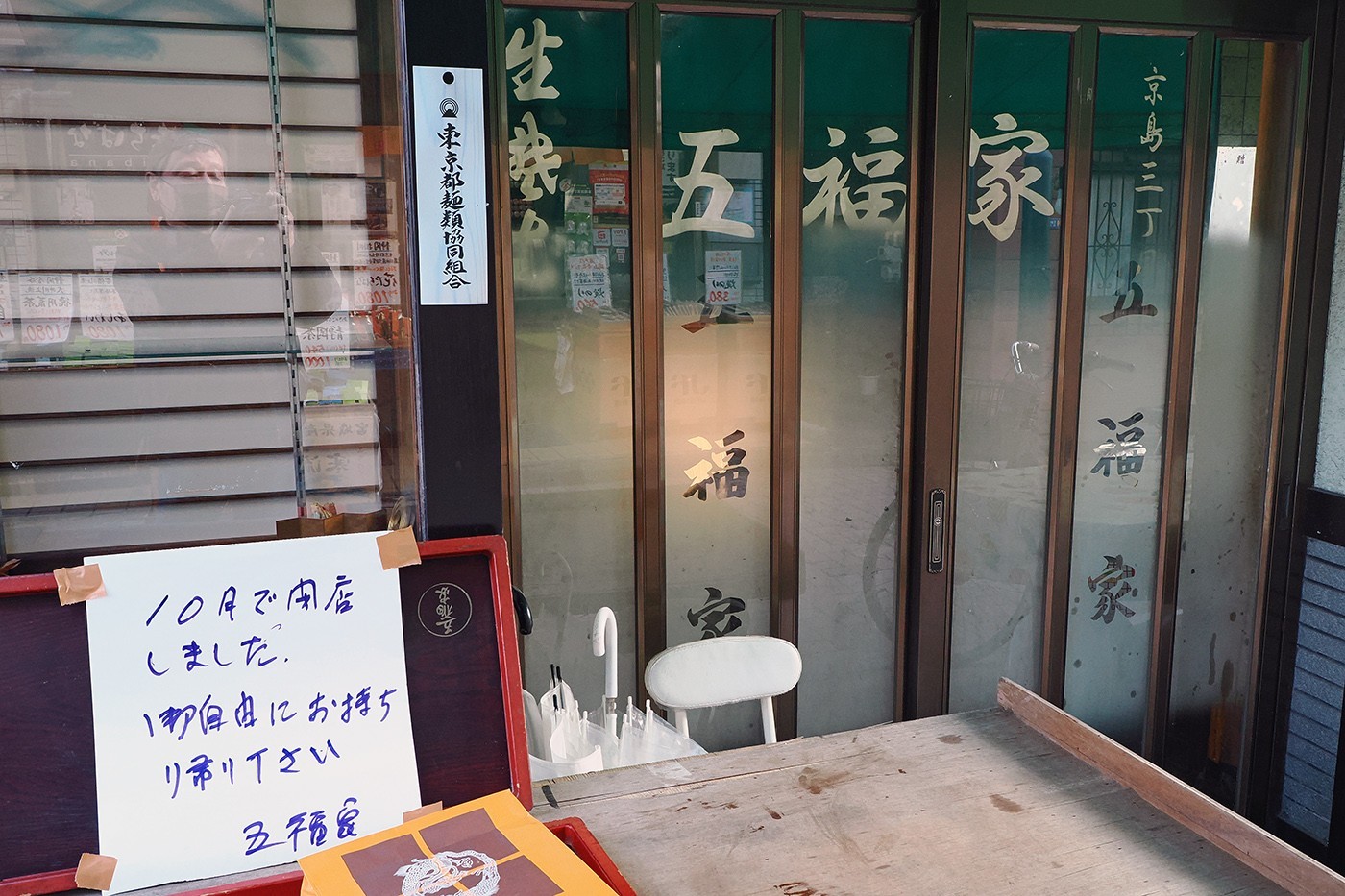 橘キラキラ商店街にあるそば屋の『五福屋』さん、閉っちゃったのね。いい様子のそば屋だったんですけどね。貼り紙に「10月で閉めました 御自由にお持ち帰りください」とある。店で使っていた備品を置いてあったんでしょうな。みんなが持ち帰り、すでに何もなかった(⑬)。
