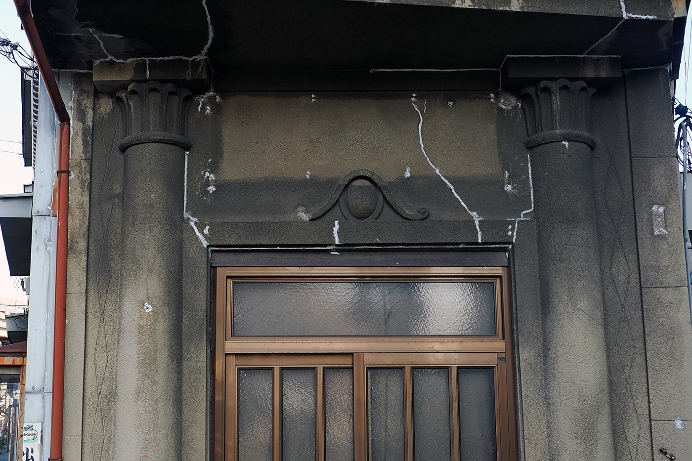 アップにすると、ドアの上の紋やコンクリートで作られた西洋の柱を模した施しが時代をうかがわせて素敵である(⑨)。
