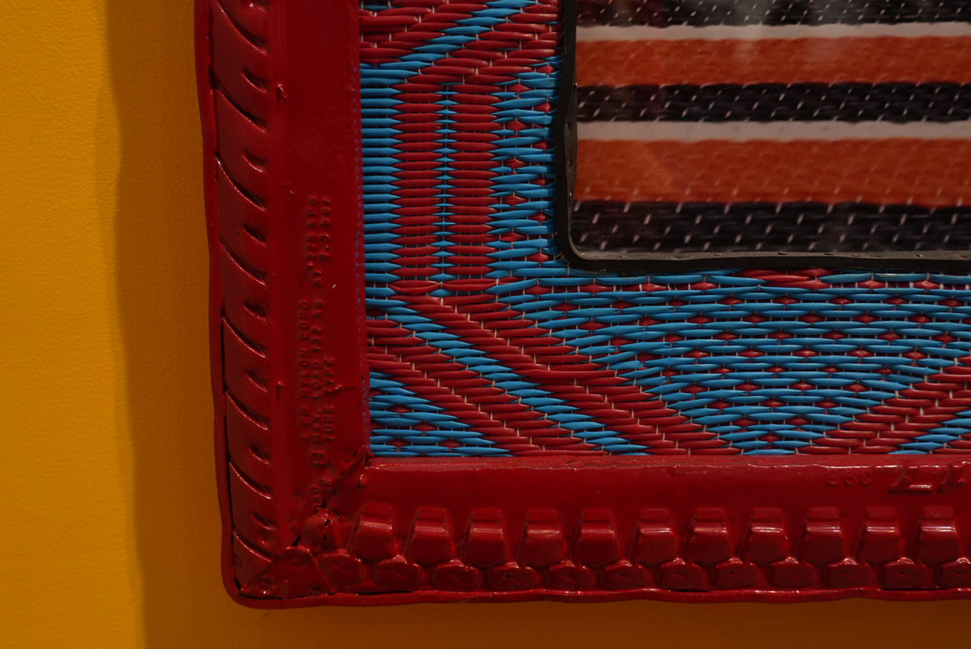 布を何百枚も収集したり、額を手作りするスタイルは東京在住の写真家うつゆみこの制作プロセスと近しい。下に挙げた作品を拡大したのが2枚目の写真だが、赤い額の部分をよく見てほしい。なんと、額の素材はタイヤだ。思わず「タイヤ?」と声が出た。