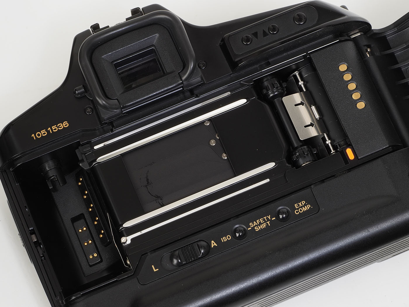 興味深いのは、フィルム巻き上げモーターと巻き戻しモーター、シャッターチャージモーターの3モーター方式を採用していることですね、仕事をそれぞれ個別のモーターで行うわけですね。
