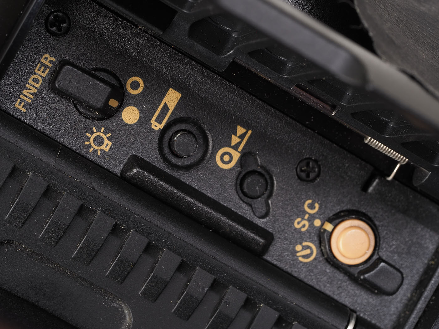 カメラの右側面のカバーの下にも設定ボタンあります。まるで隠し部屋ですね。単写とか連写とかの切り替えとか途中巻き戻しボタンとか、ファインダー内表示の切り替えとか。