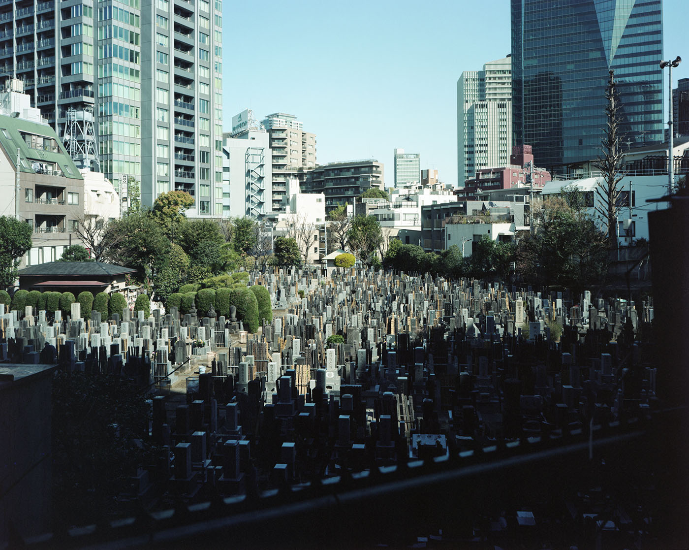 少し歩くと思いかげず視界が開けた。あれ?という感じだった。遠くにのビルの点滅が見えた。足元には闇が広がっていた。目が慣れてくると無数の墓標であることがわかった。