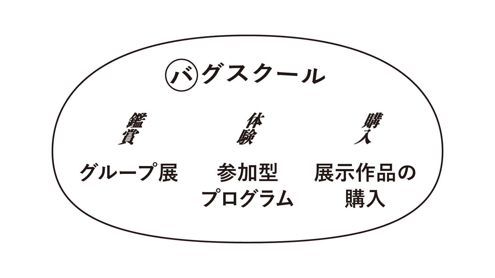 「バグスクール」はグループ展と参加型プログラムを組み合わせたアートプロジェクト。インディペンデント・キュレーターの池田佳穂がBUGと協働で考案し、今年で3回目の開催となる。アーティストと対話し、学び合うなかでの作品購入体験も創出する。BUGの活動方針の一つであるキャリアの支援に基づき、作品販売経験の少ないアーティストにその機会を提供する。作品販売に関する書類作成や、価格やサイズの検討などのプロセスにも関わり、アーティストの活動の幅を広げる応援をしていく。売上は、アーティスト収入分、配送経費等を除いた全額を「セーブ・ザ・チルドレン」に寄付する。