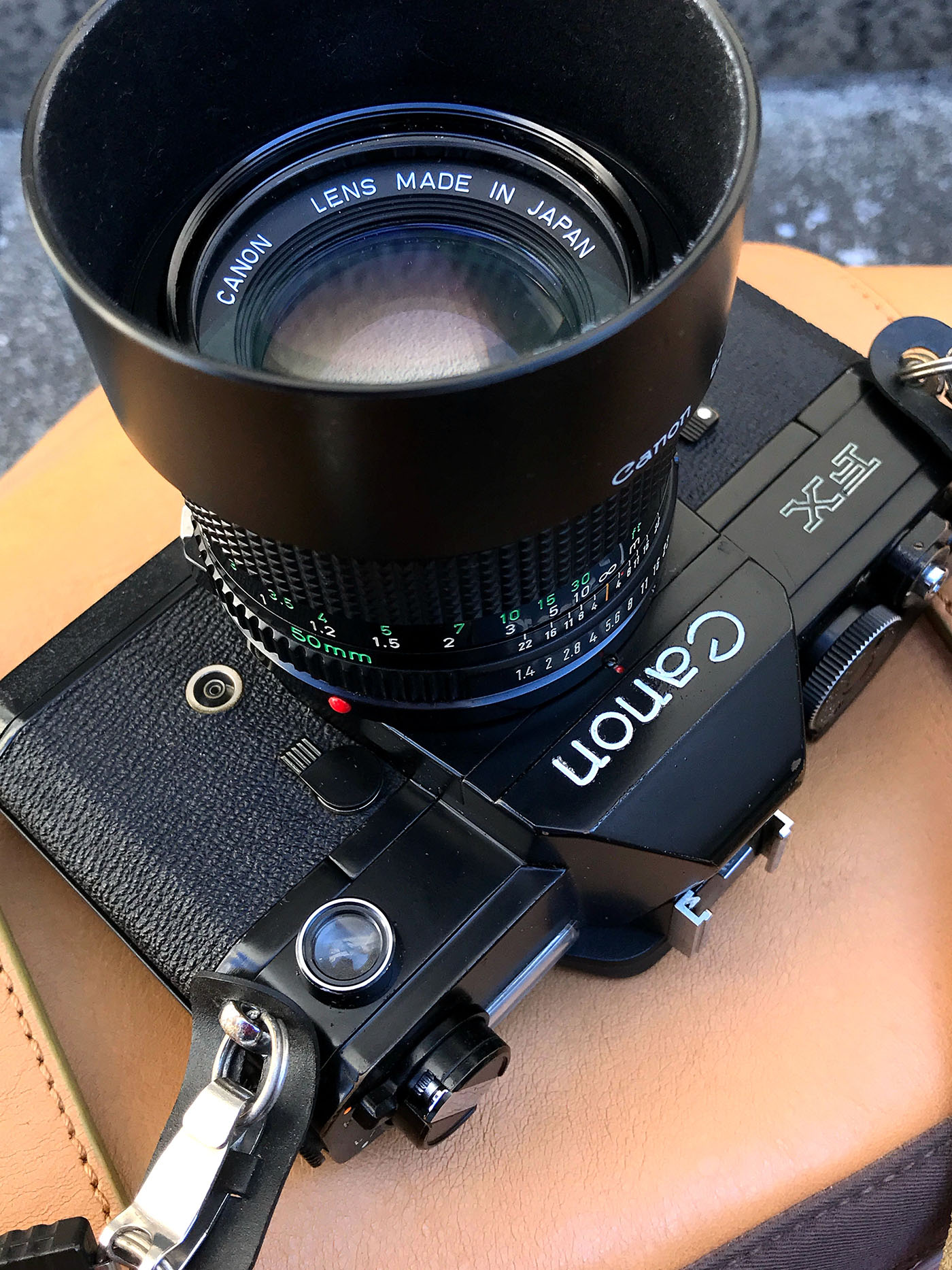 5年前くらいの写真です。キヤノンFXは愛でるだけではなく屋外に持ち出して使用していましたね。装着レンズがNew FD 50mm F1.4だったりするところがいいでしょ。実用本位で考えています。