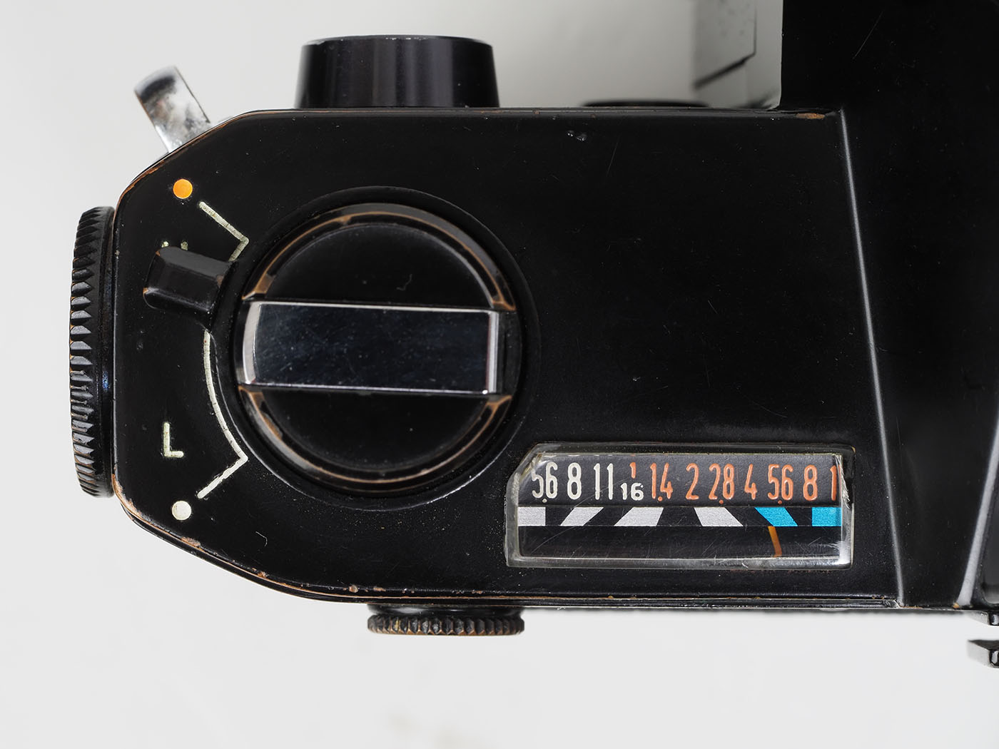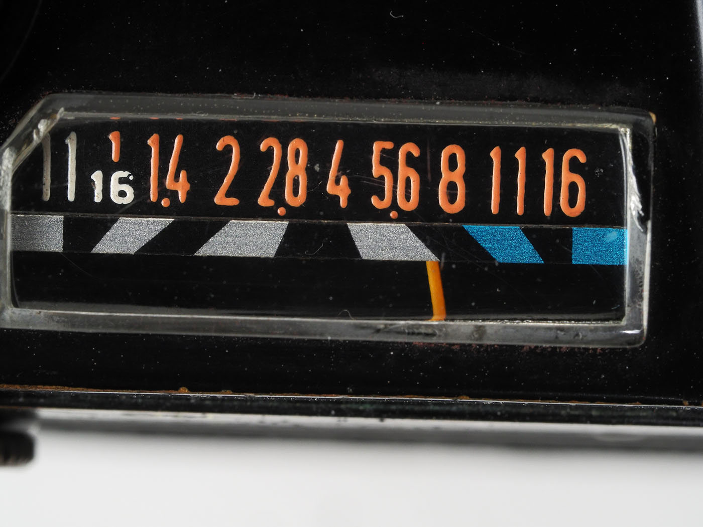 メーター窓をドアップにしてみましたが肉眼では指針もよく見えません。EV値切り替えで表示はオレンジと白に変わるわけです。適宜なシャッタースピードを選択した後に指針のf値を見て、絞り環に同じ数値をセットします。