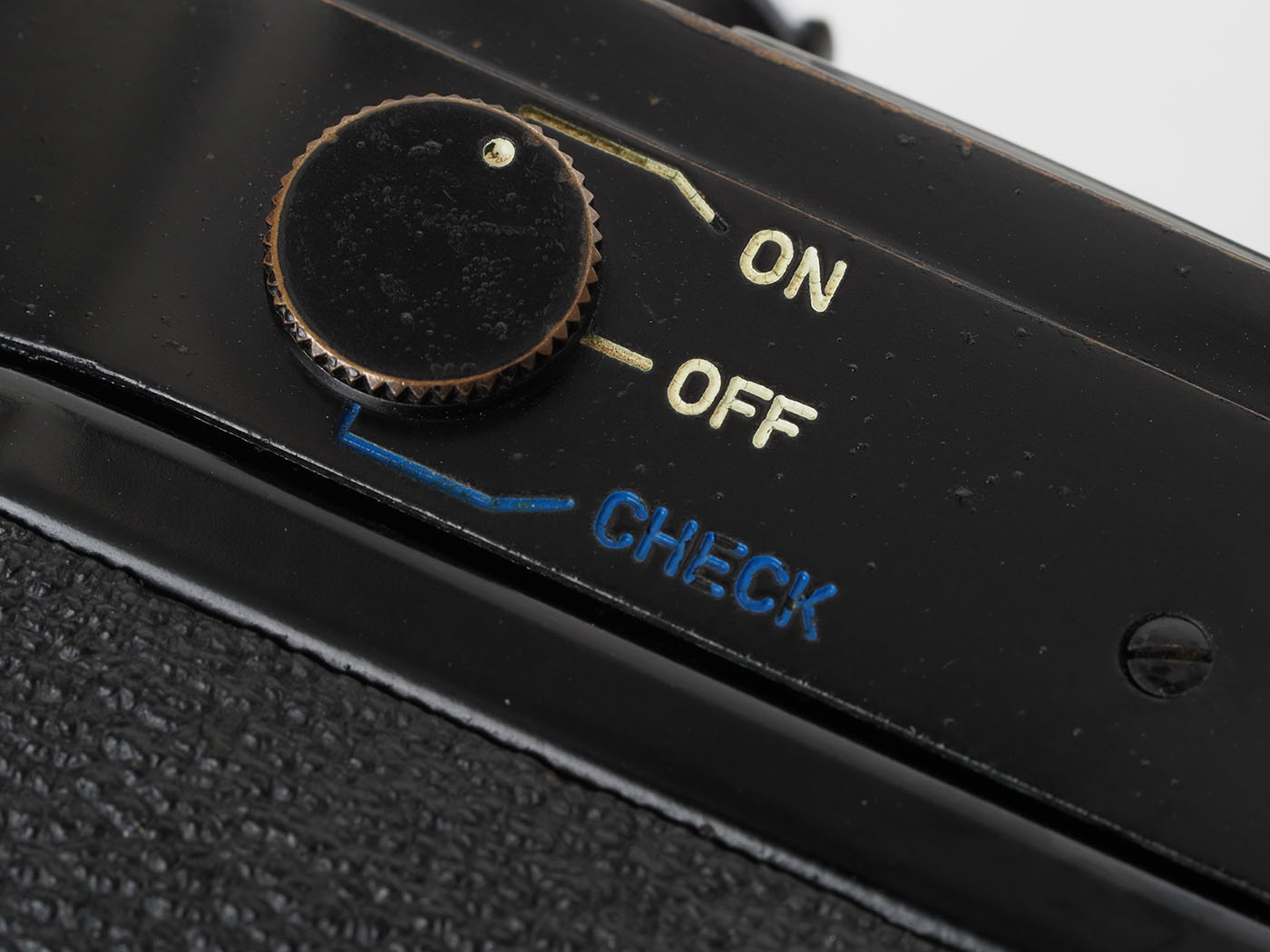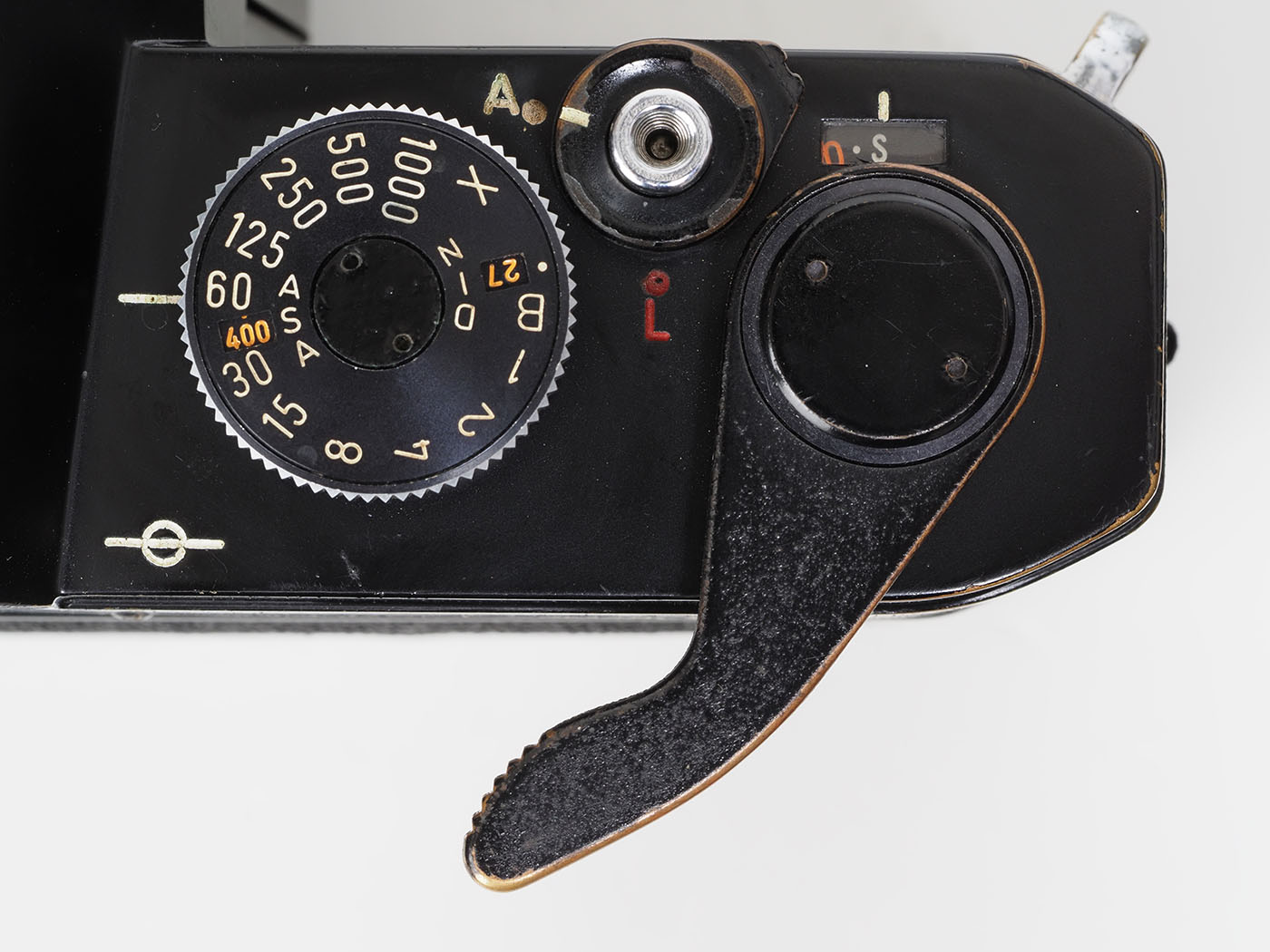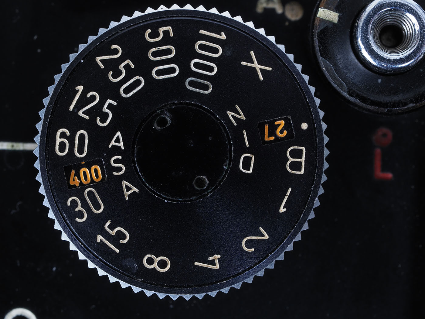 シャッタースピードダイヤルもどアップで撮影してみます。フィルム感度の窓なんか蟻よりも小さいんじゃないかなあ。装着レンズをルーペ代わりにして設定したり。ま、実際の撮影ではメーターなんか見ないから、バッテリーは抜いてあります。