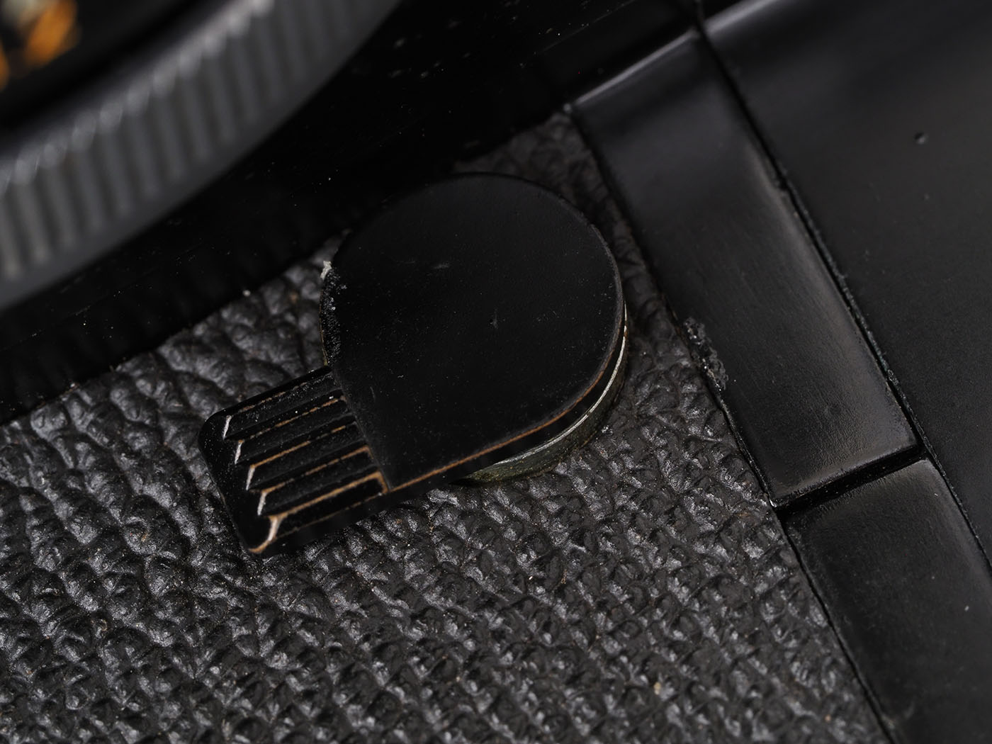 ボディ左前にミラーアップのノブがあります。キヤノン19mmとかつけちゃう人とかいたのかな。外部測光だからミラーアップしても、メーター動くし。
