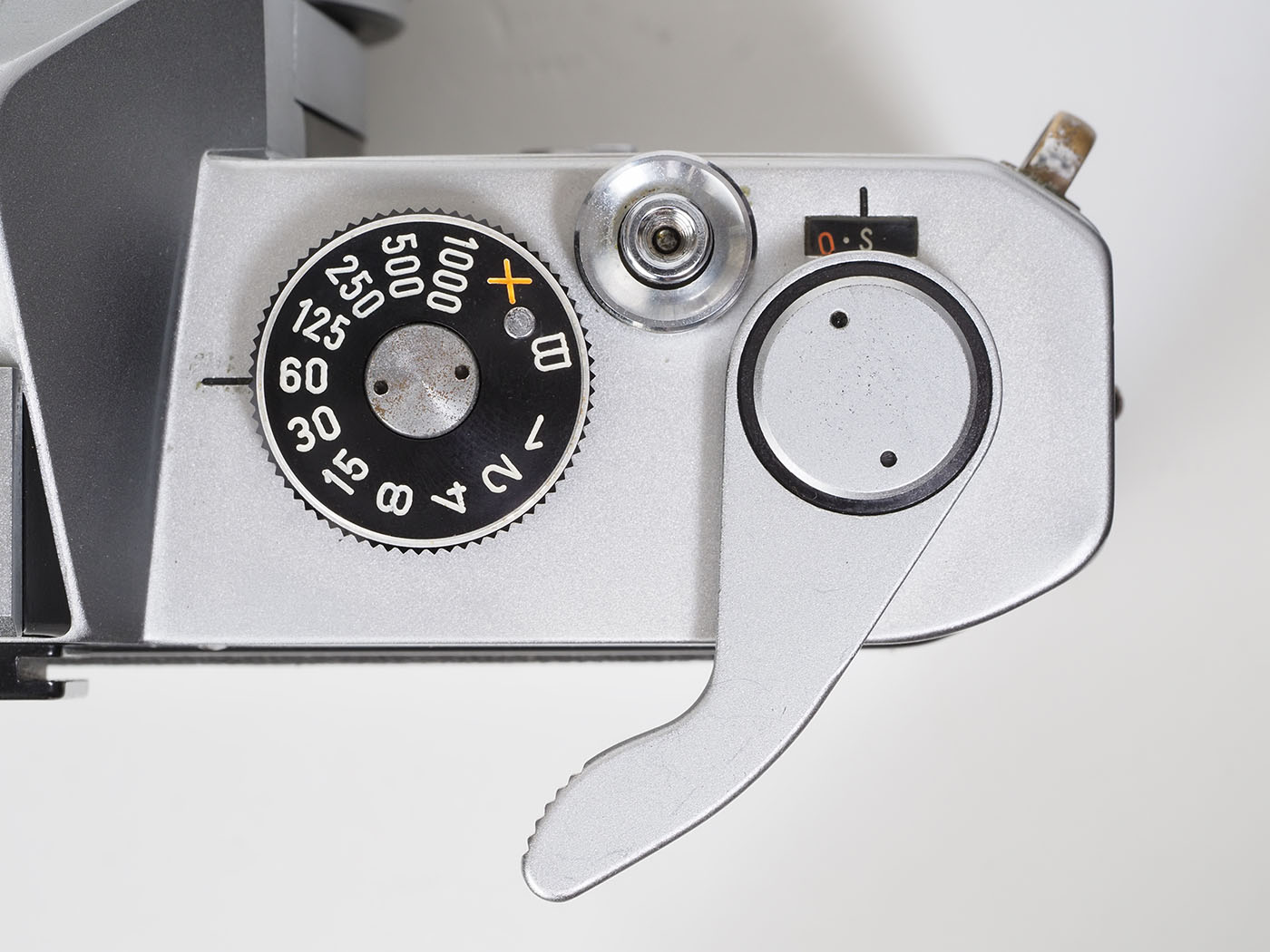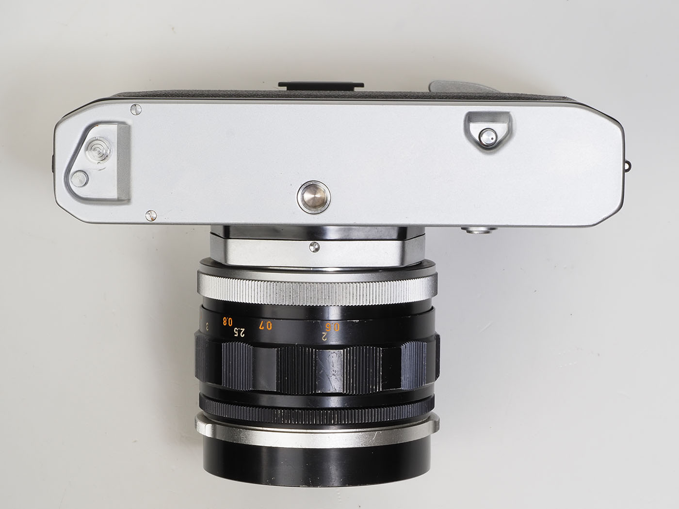 キヤノンFXと同型とは思いますが、細部に違いがあったり。金型は別なのでしょうか。だとすると無駄遣いですね。でもシンプルで綺麗なカメラです。正面のミラーアップノブが目立ちますが、この当時のユーザーのみなさまは、そんなに多用したのでしょうか。