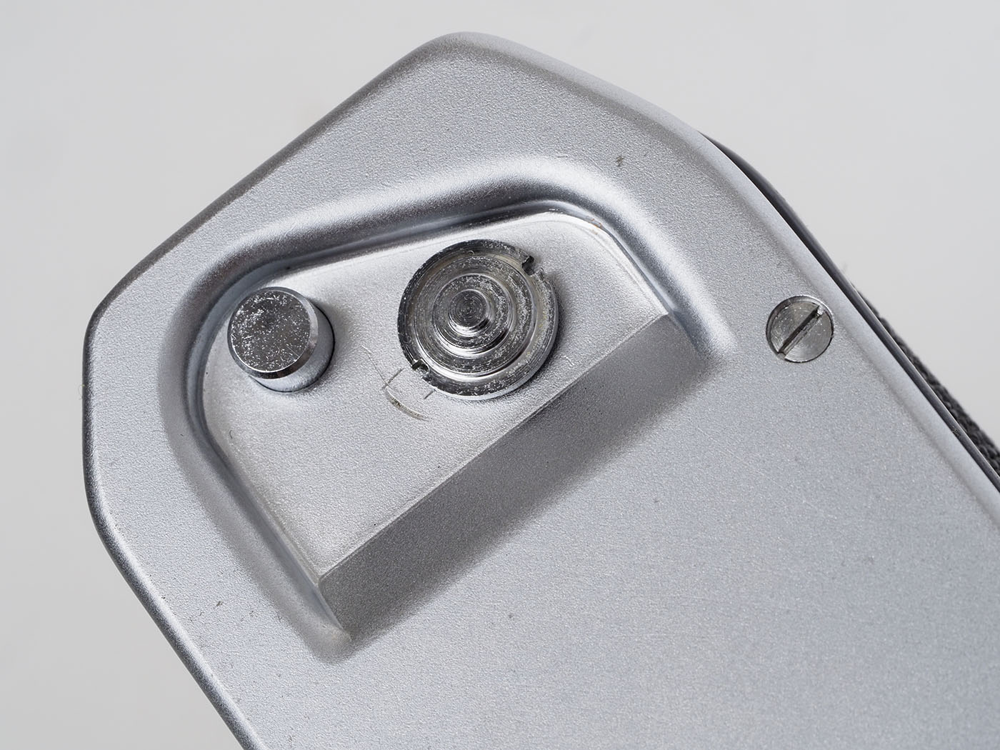 謎なのは裏蓋開閉にはボタンを使用することです。裏蓋を開くには右の大きいほうのボッチをボタン方向にスライドして、ボタンを押します。面倒です。ちなみにFXはキー方式ですね。